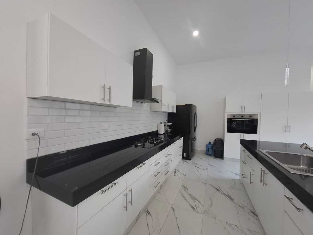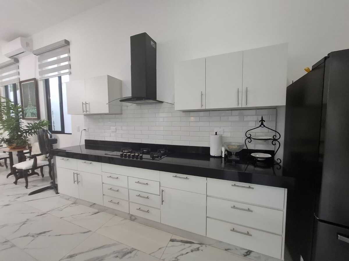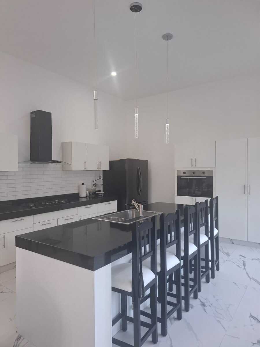 • Cocina equipada e integral, con isla, acabo de granito, con horno, parrilla de 5 quemadores.