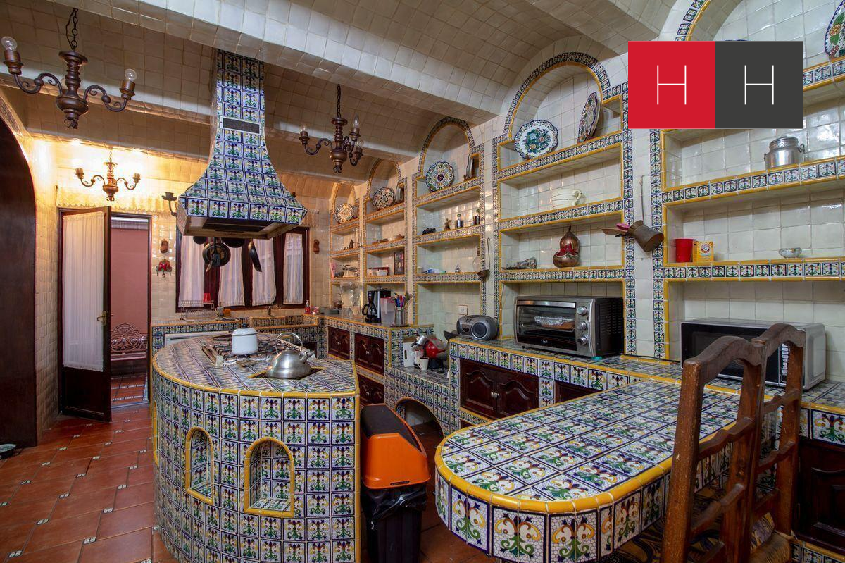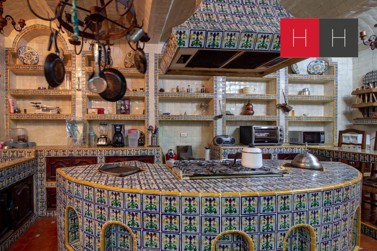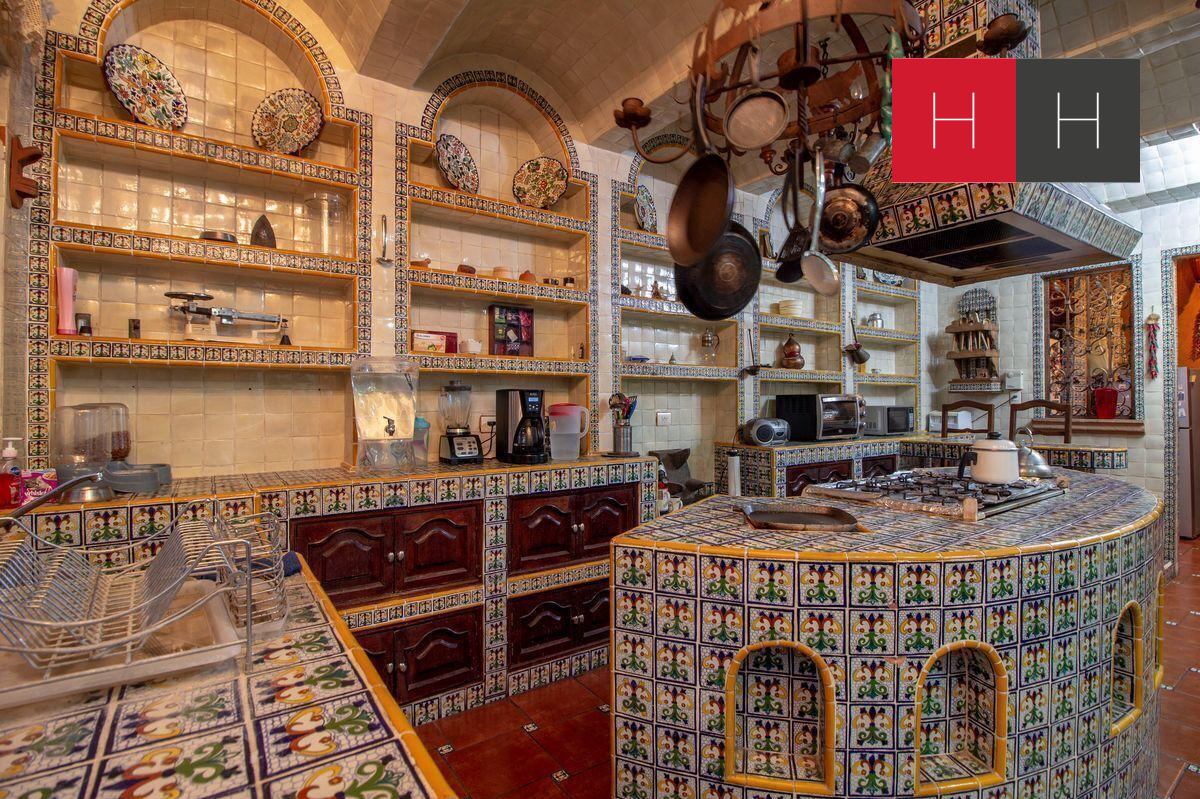 Sala com lareira, sala de jantar, cozinha com design e acabamentos, belamente decorada com Talavera com área de café da manhã, despensa e uma pequena adega.
