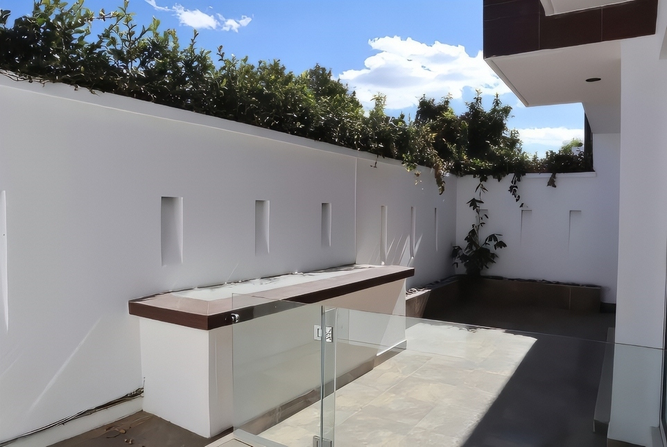 La espaciosa sala se conecta al agradable patio por medio de puertas en cristal que se deslizan hacia los lados