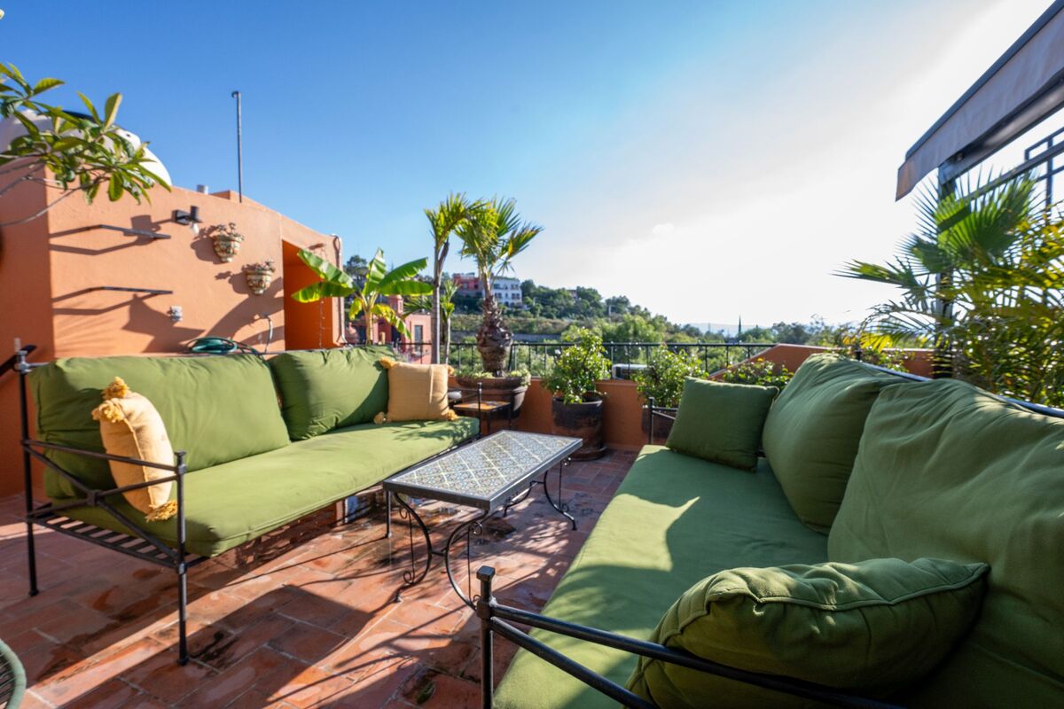 Featuring three bedrooms and three bathrooms, the home is sold partially furnished and showcases beautiful handcrafted details—wooden beams, traditional finishes, and a layout that feels both cozy and open. The back of the property overlooks a lush shared garden with mature trees, offering peace and privacy within a secure gated community.