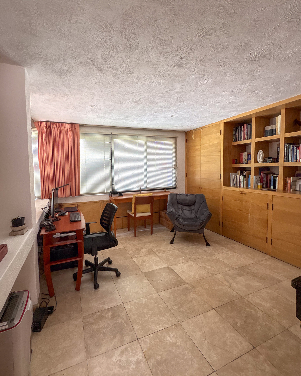 1er nivel: sala, comedor, cocina integral, antecomedor, recámara con baño, patio recibidor, jardín de 70 m2, terraza y estudio.