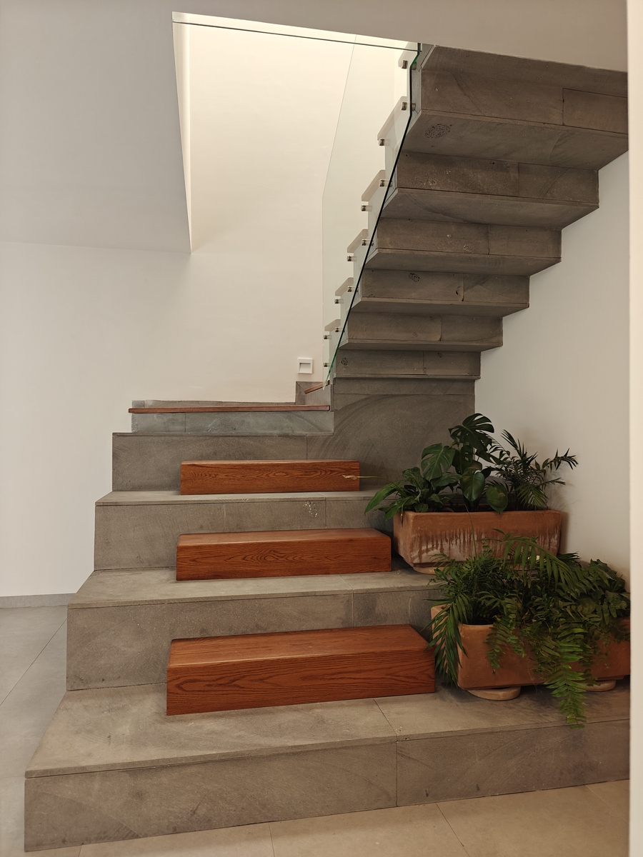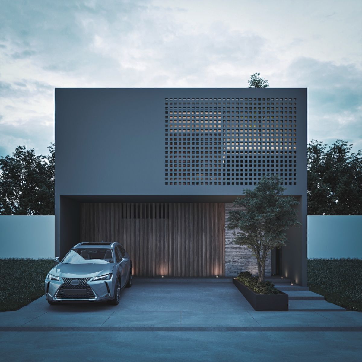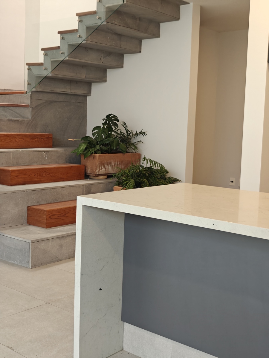 Térreo: Garagem para dois carros, pequeno depósito, lavabo para visitantes. Sala, sala de jantar com janelas grandes voltadas para o jardim. Cozinha integrada com balcão e coifa, lavanderia.