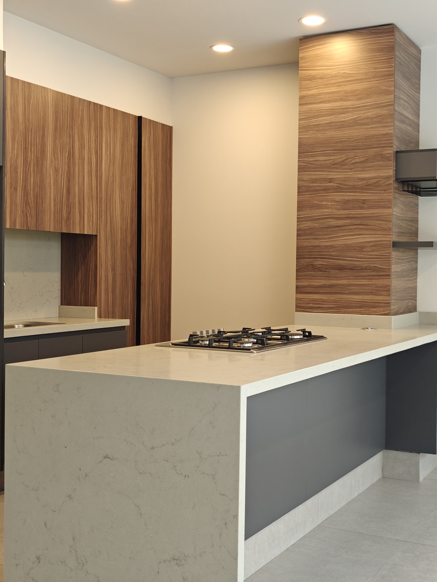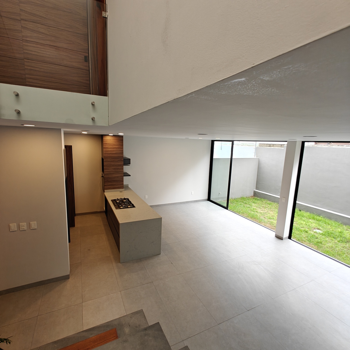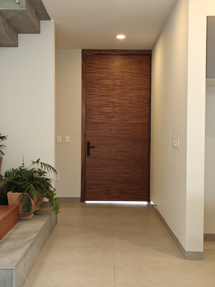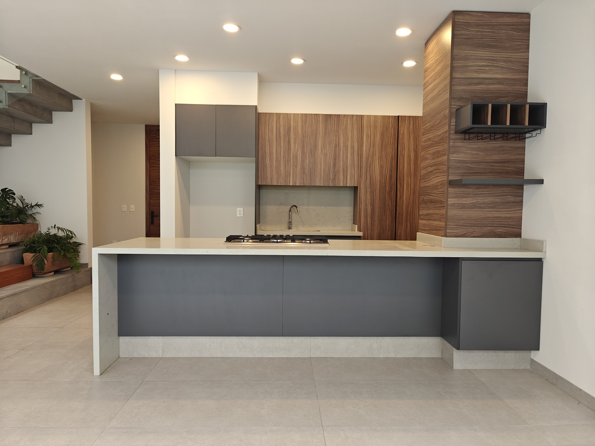 PB: Cochera para dos autos, bodeguita, medio baño de visitas. Sala, comedor con ventanales hacia el jardín. Cocina integral con barra y campana, cuarto de lavado.