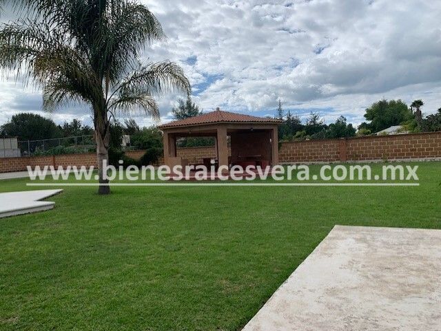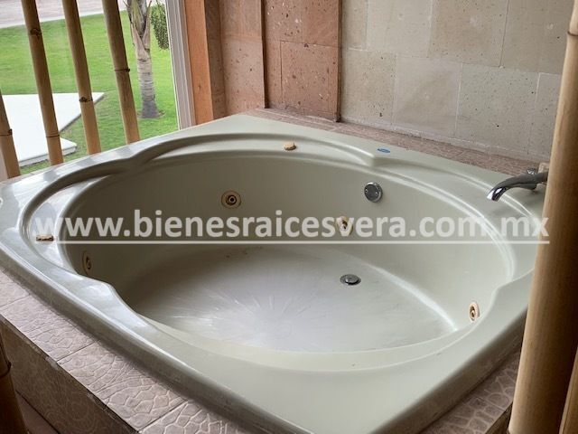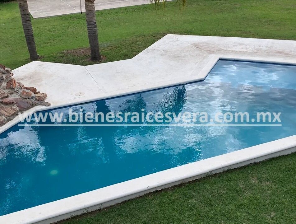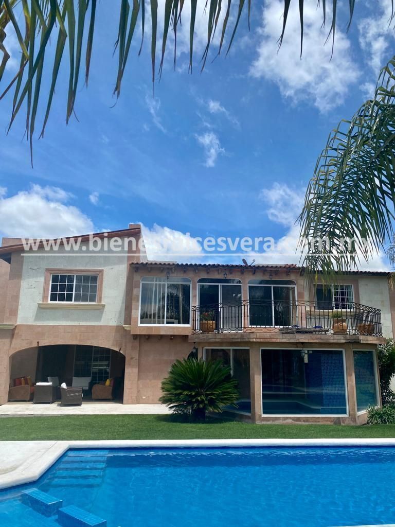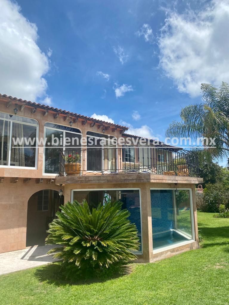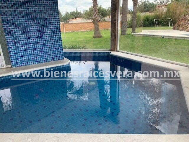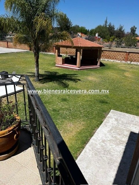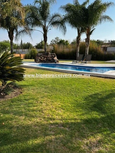 Sala de tv con jacuzzi y terraza, techos de madera, terraza una con asador, kiosco con asador, alberca con calefacción gas y solar, alberquita interior con baño completo, palapa con asador, cuarto de lavado, cancha de tenis, hermosa alberca, jardín con palmeras, árboles frutales.