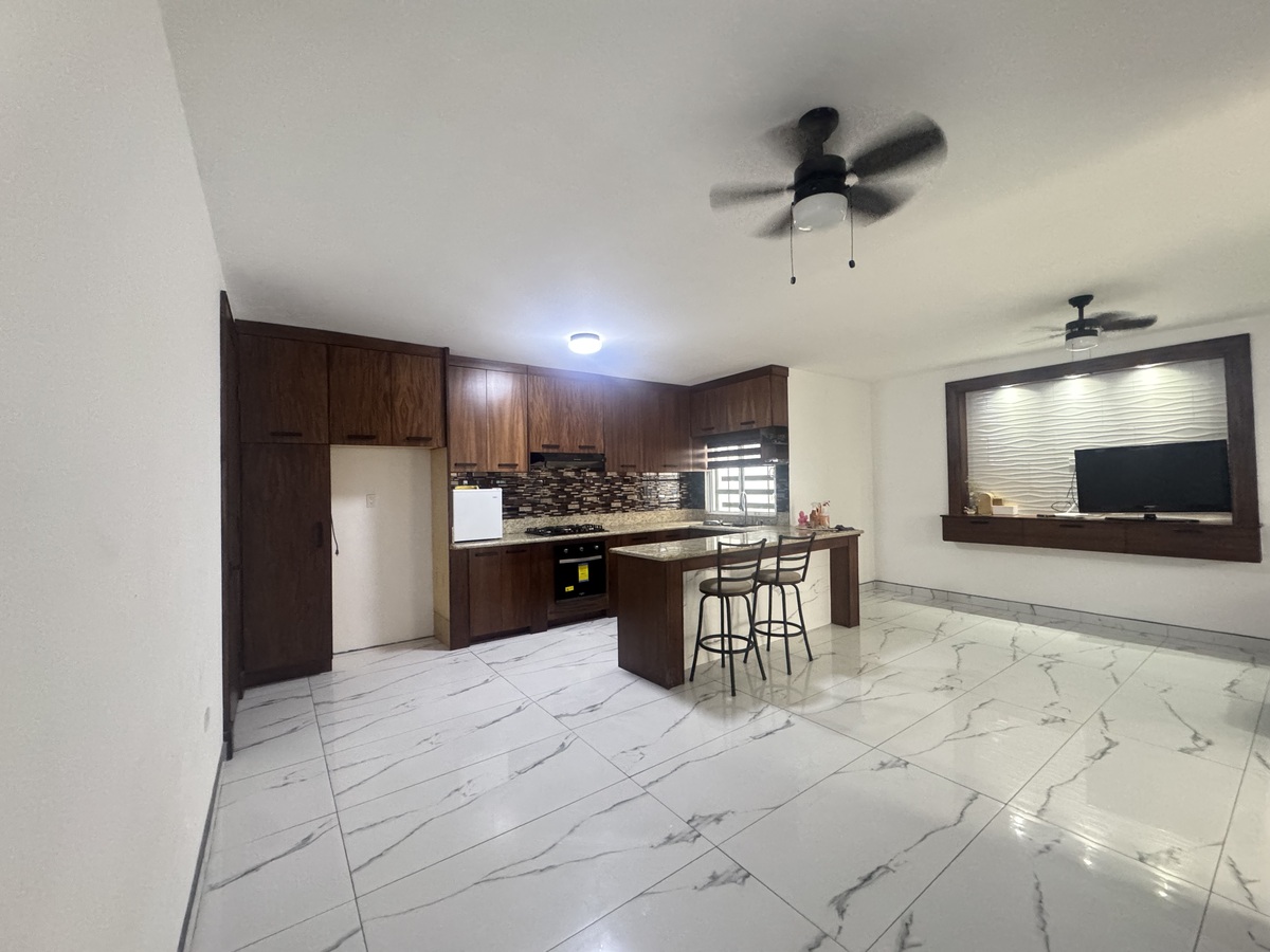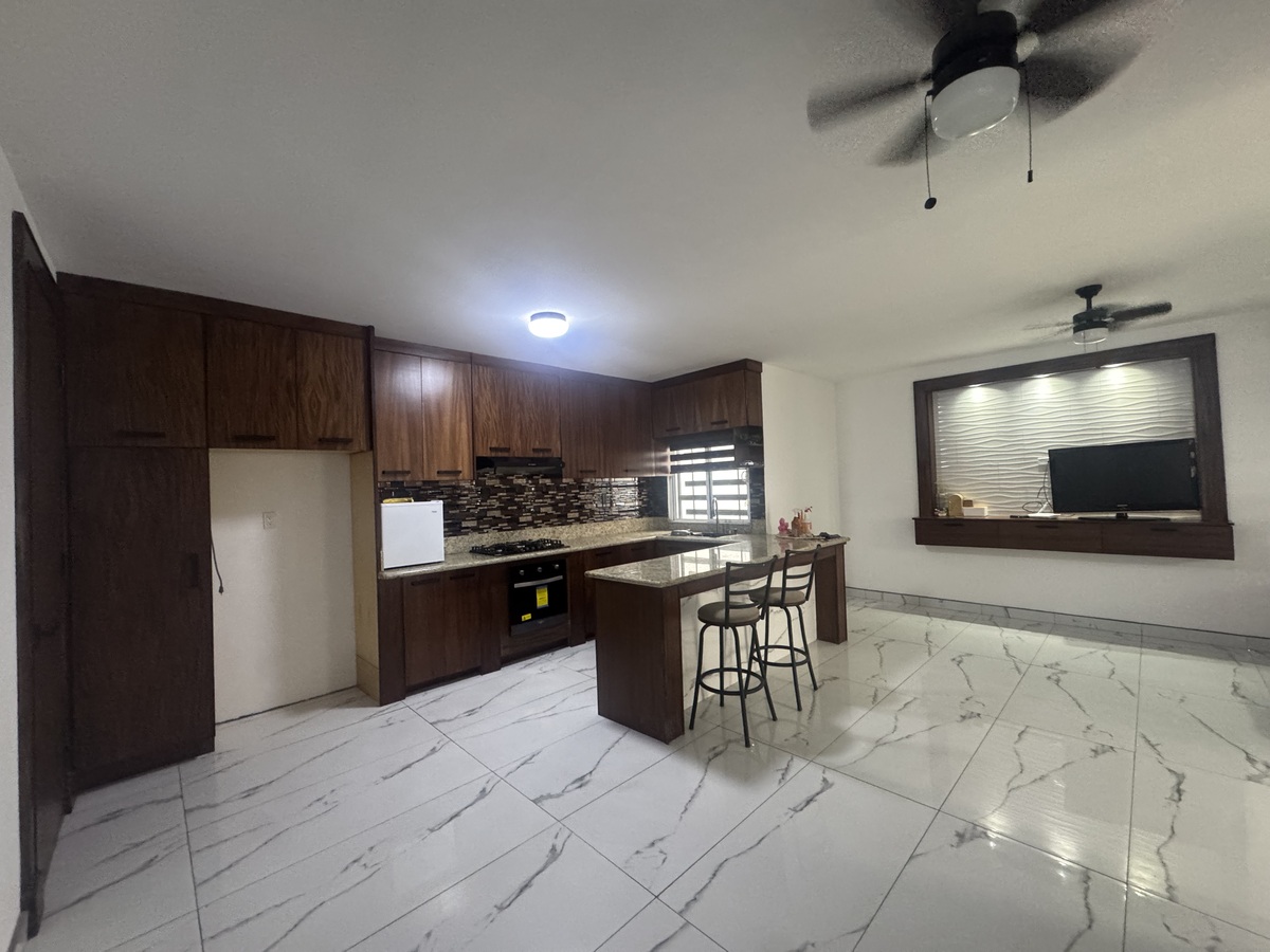 • Cocina integral con cubierta de granito y carpintería en parota, un toque de elegancia natural