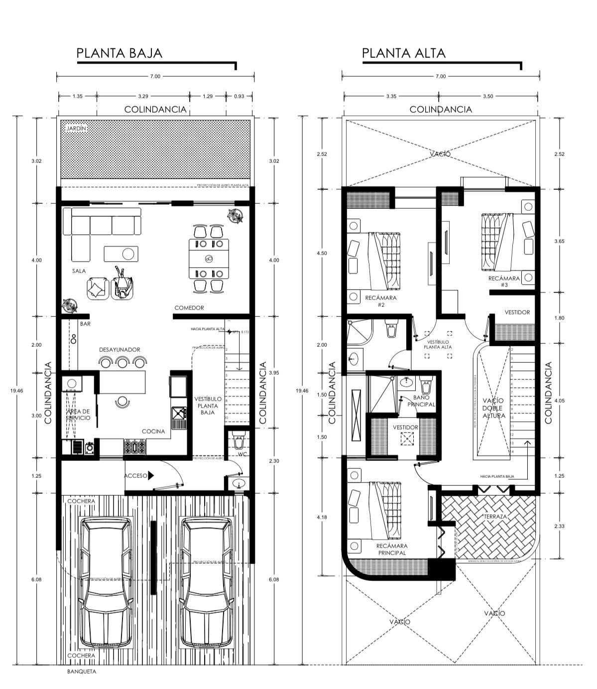 Planta alta: Recámara principal con vestidor, baño completo y acceso a terraza; dos recámaras secundarias con clóset que comparten un baño completo, además de un vestíbulo que conecta los espacios y un diseño con doble altura que aporta amplitud y mejor iluminación natural.