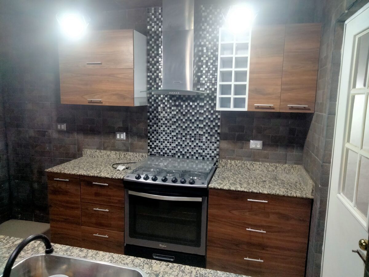Cocina vestida con gabinetes de madera, estufa empotrada, campana y meseta de granito con triturador