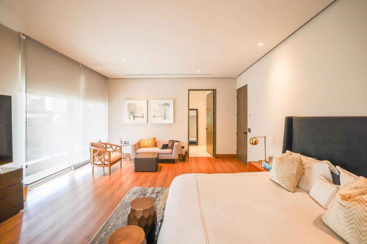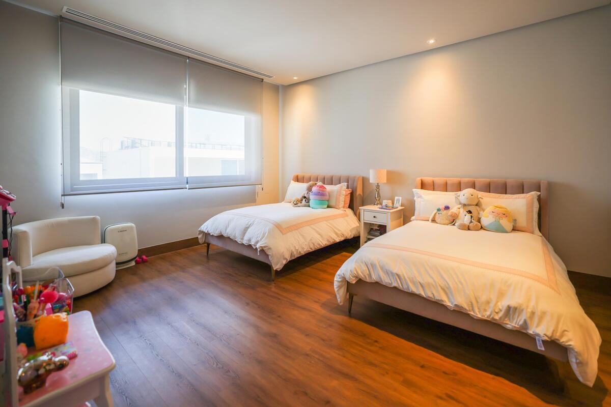 Primera planta: Recibidor, sala, comedor, bar, amplia cocina con isla, jardín con pasto sintético, lavandería, cuarto de servicio y medio baño de visitas. Cochera para 3, bodega y doble pasillo lateral.