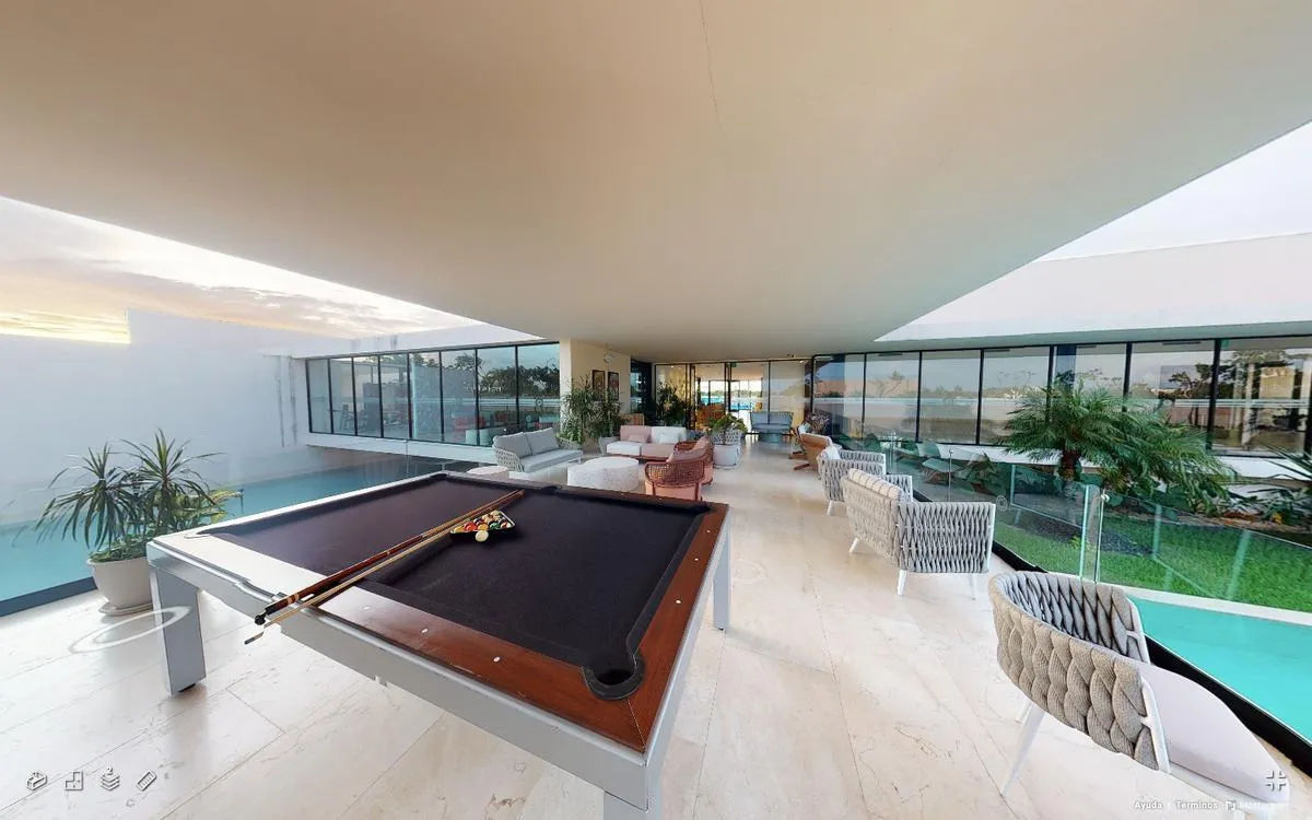 • Sala de estar e jantar com jardim interno com acesso direto à varanda e vista para a piscina