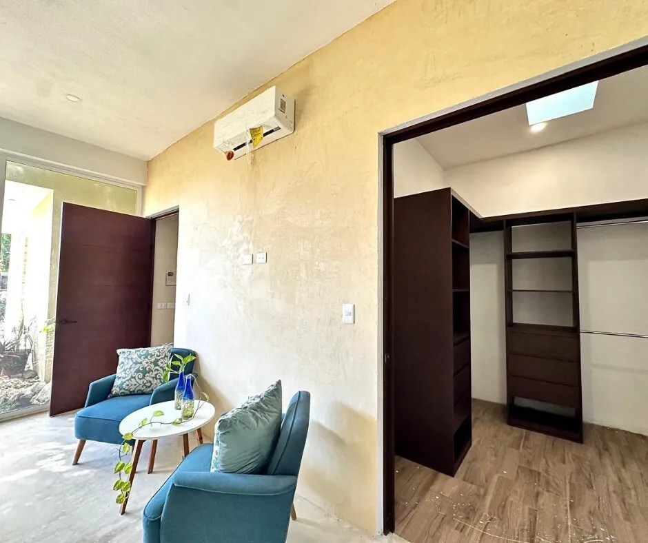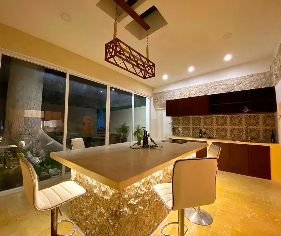 - Cocina: Isla amplia con estufa eléctrica, gavetas de madera, acabado con chukum, piso de pasta y aire acondicionado