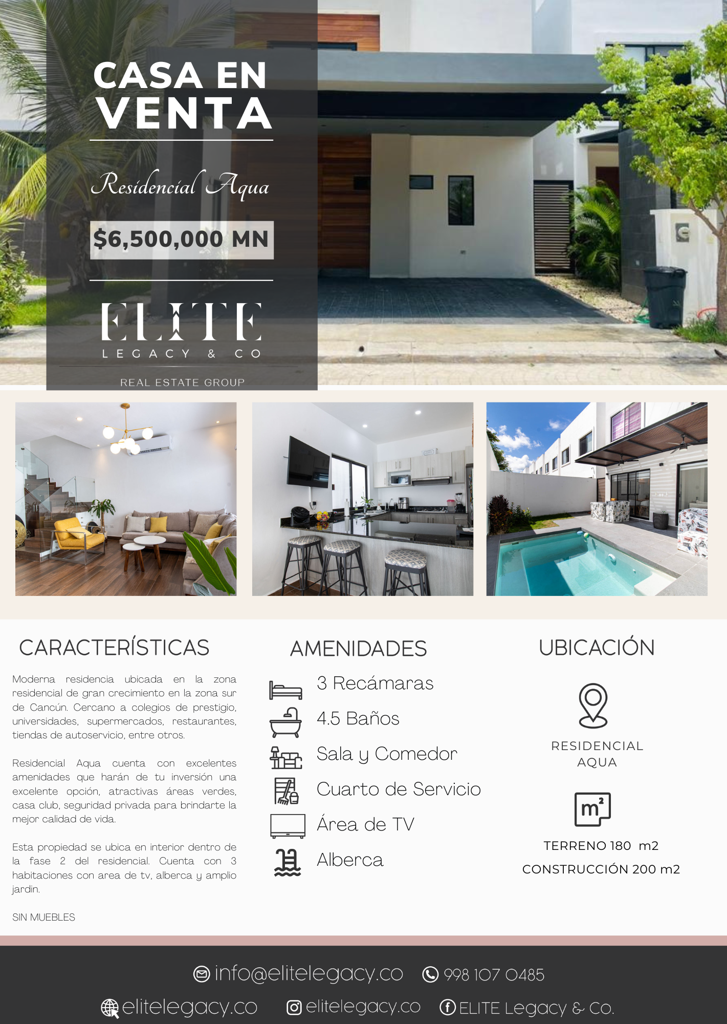 A segurança é primordial, com duas cabines de acesso e vigilância 24/7 para garantir sua tranquilidade. Esta propriedade é apta para crédito e representa um investimento inteligente em uma das áreas mais desejadas de Cancún.Descubre esta moderna residencia ubicada en el exclusivo fraccionamiento Aqua Residencial, al sur de Cancún. Esta propiedad se encuentra en la Fase 2 del desarrollo y es ideal para quienes buscan calidad de vida en una zona de gran crecimiento. A pocos minutos de colegios de prestigio, universidades, supermercados, restaurantes y tiendas de autoservicio, esta casa ofrece comodidad y conveniencia.