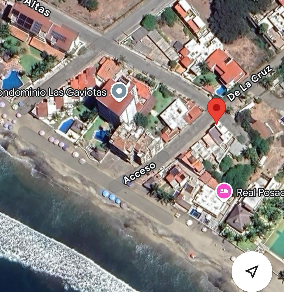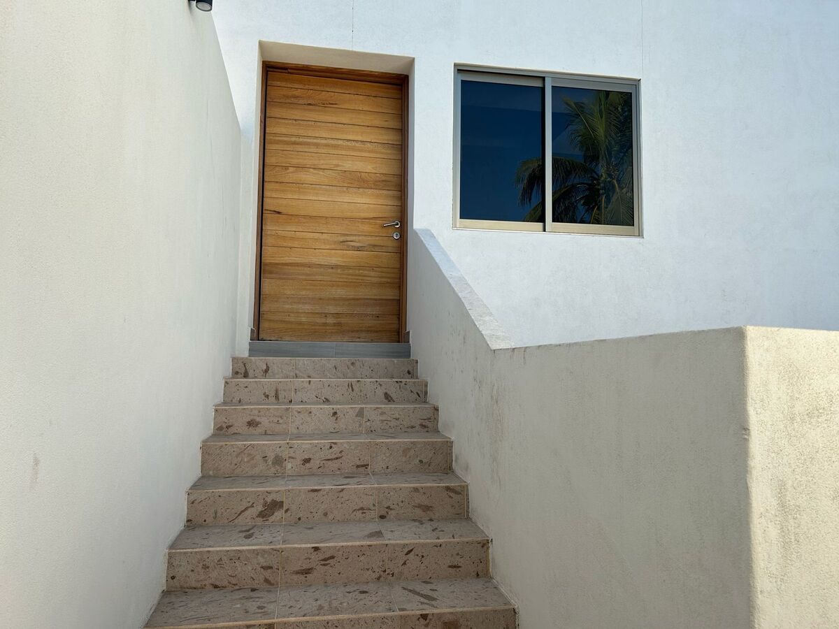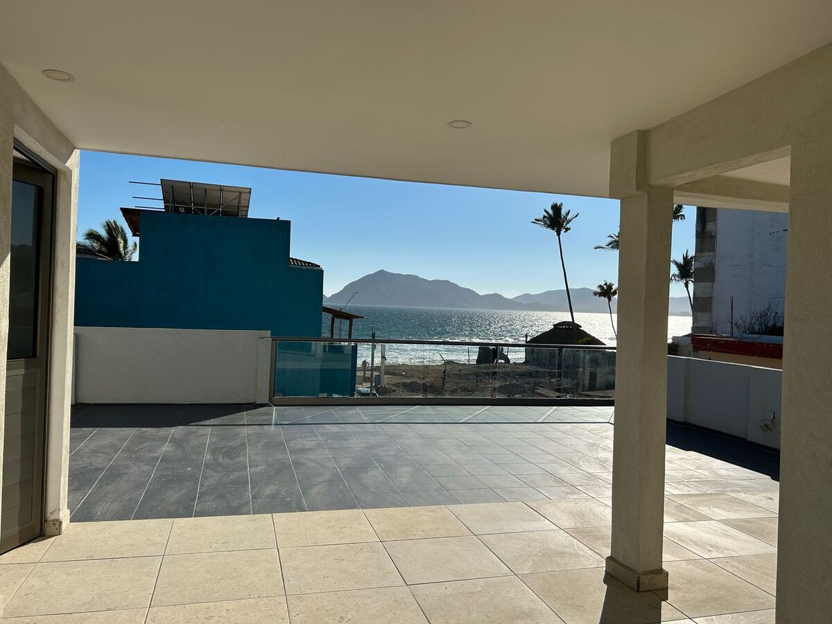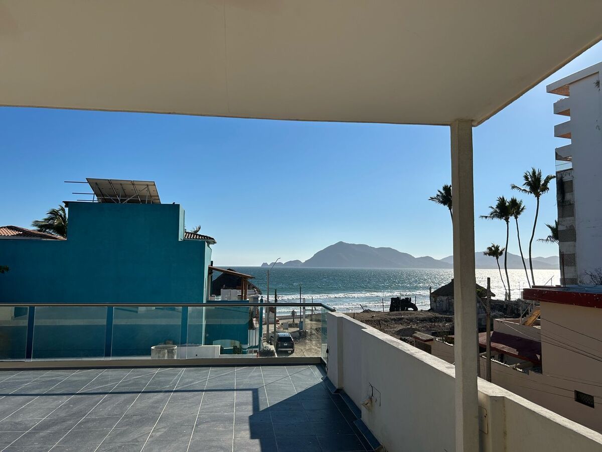 Departamento principal: cochera para un auto con portón, sala, comedor, estancia, cocina integral, un baño completo, dos recámaras con closet, lavandería y terraza techada con barra, medio baño y vista a la playa.