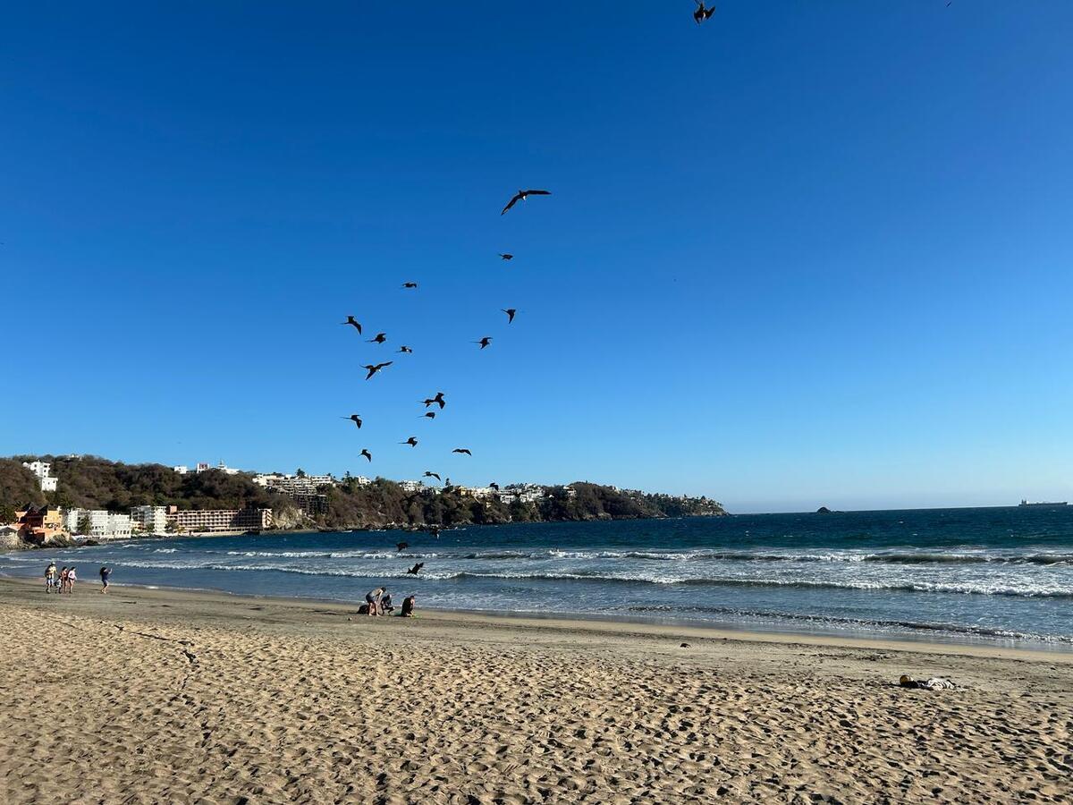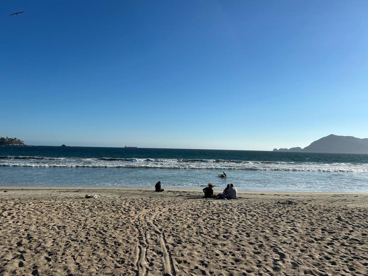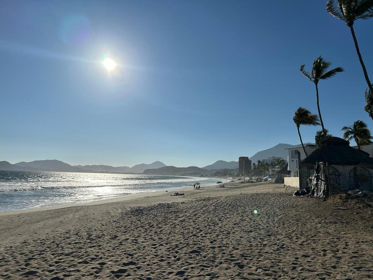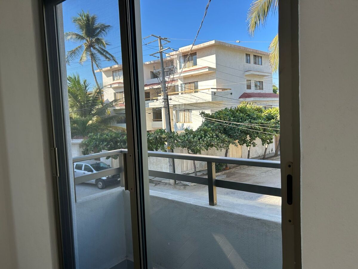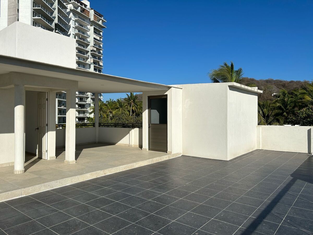 Departamento principal: cochera para un auto con portón, sala, comedor, estancia, cocina integral, un baño completo, dos recámaras con closet, lavandería y terraza techada con barra, medio baño y vista a la playa.