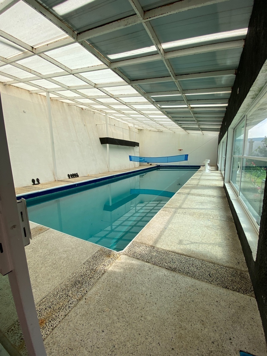 Alberca techada con terraza y baños, ideal para disfrutar en cualquier temporada del año.