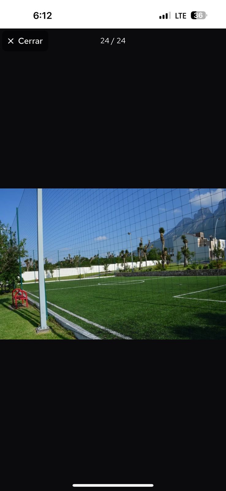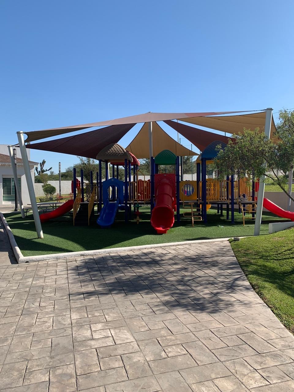 cancha de fútbol de pasto sintético, área de juegos infantiles, Casa Club / área cerrada y área de alberca con palapa.