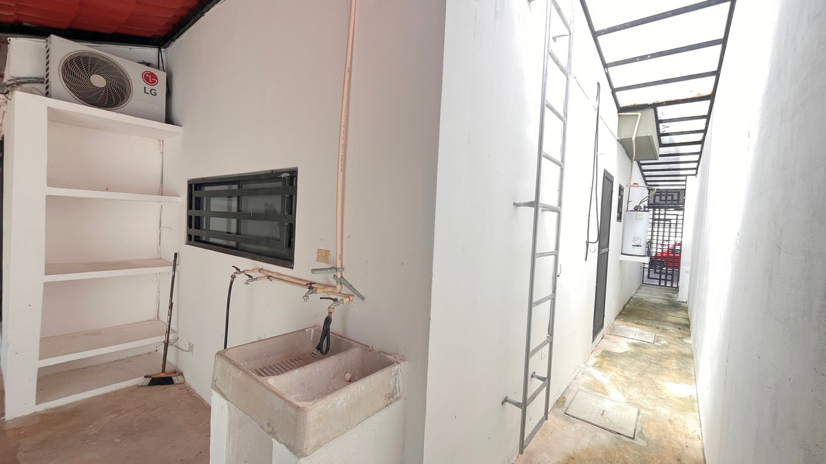 Espacio para colocar la lavadora o centro de lavado techado con repisas.