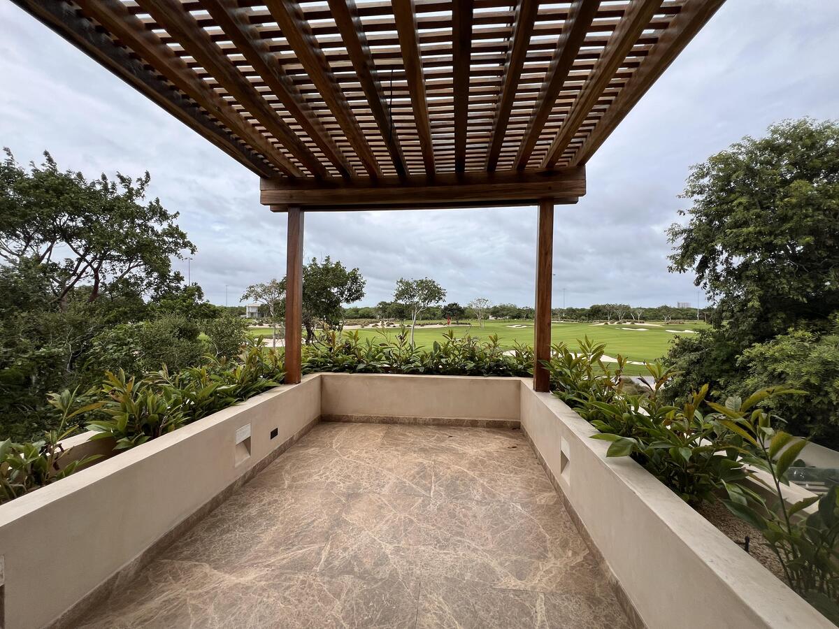 -1 Recámara principal con sala de TV y terraza exterior, vista al campo de golf.