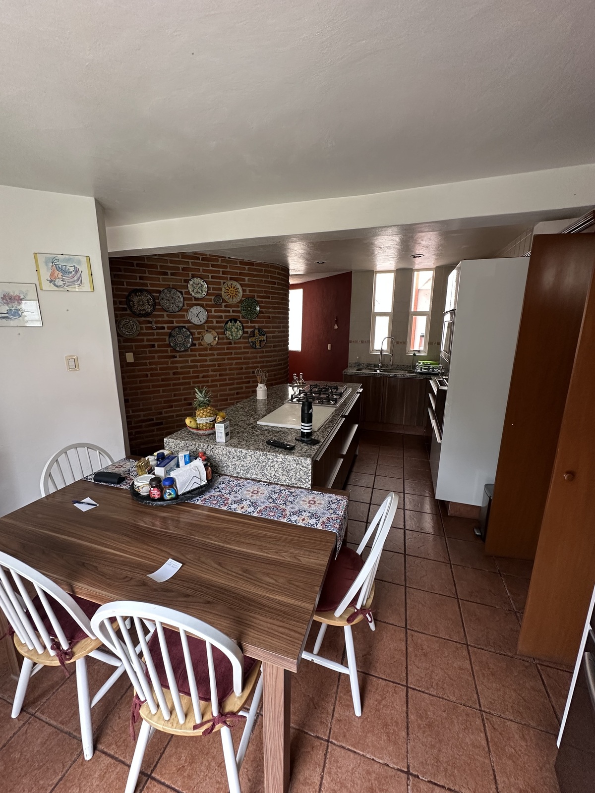 Cocina integral , alacena y vista a jardin