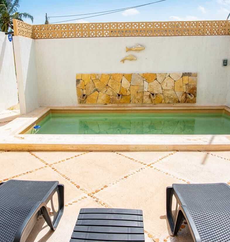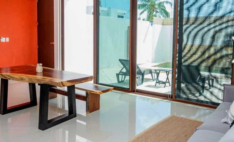 Cuenta con cortinas, mosquiteros y ventanales que son puertas hacia la alberca.