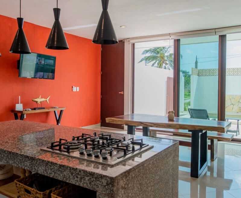 Cocina open plan equipada con estufa, refrigerador, cafetera, micro ondas y utensilios con barra desayunador, comedor y sala.