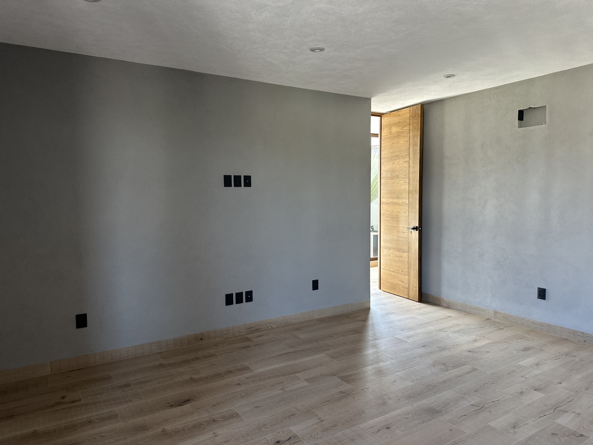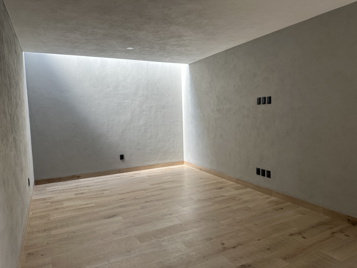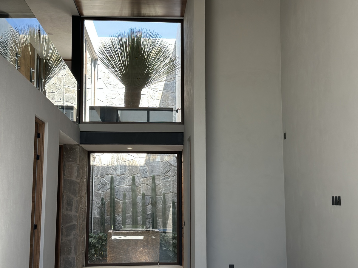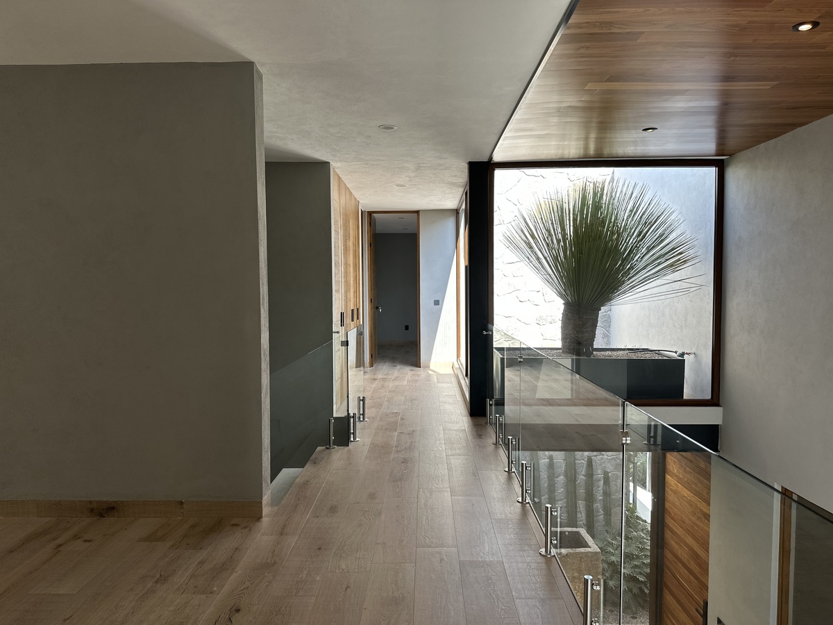 En cuanto a detalles, la casa presenta pisos de porcelanato de gran formato, una escalera de encino con barandal de vidrio templado.