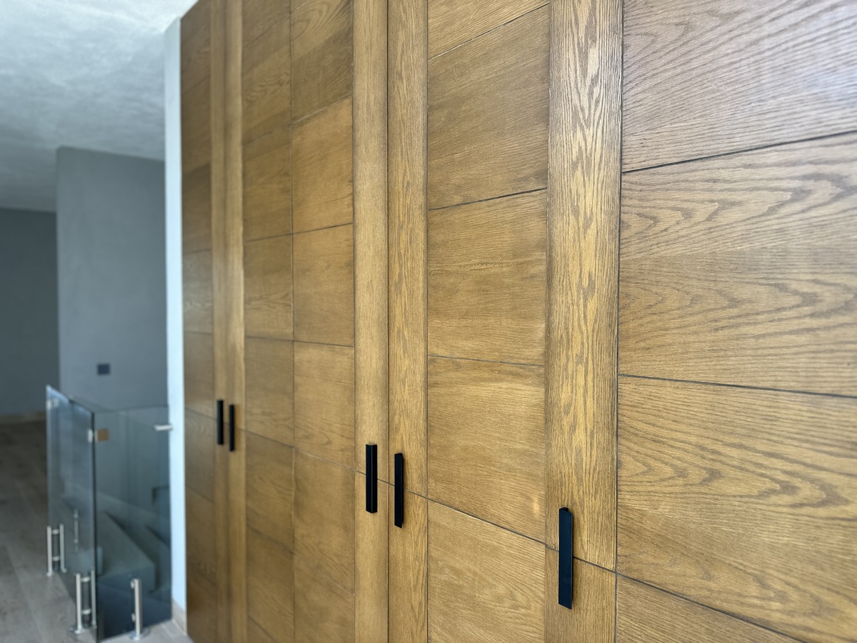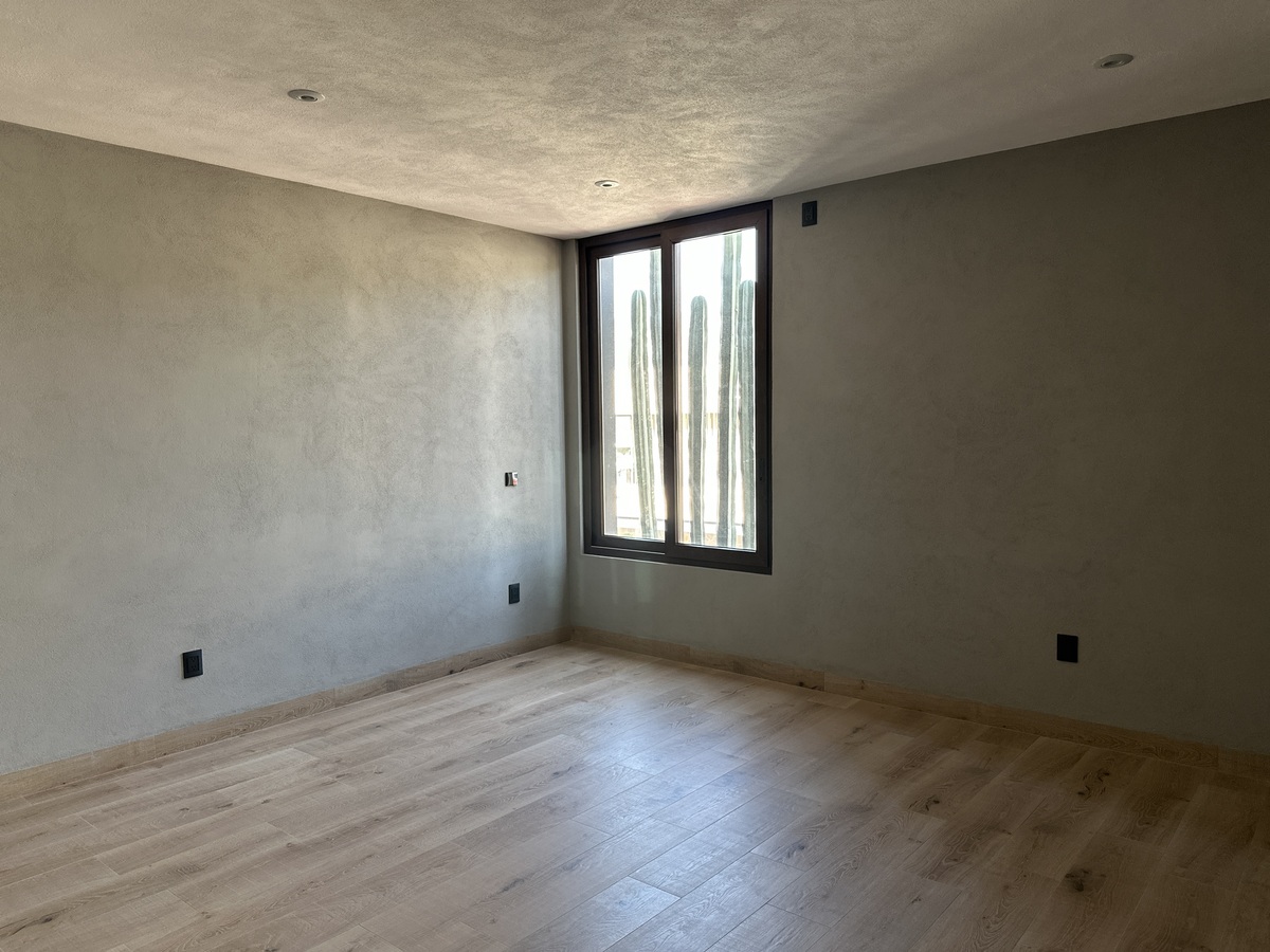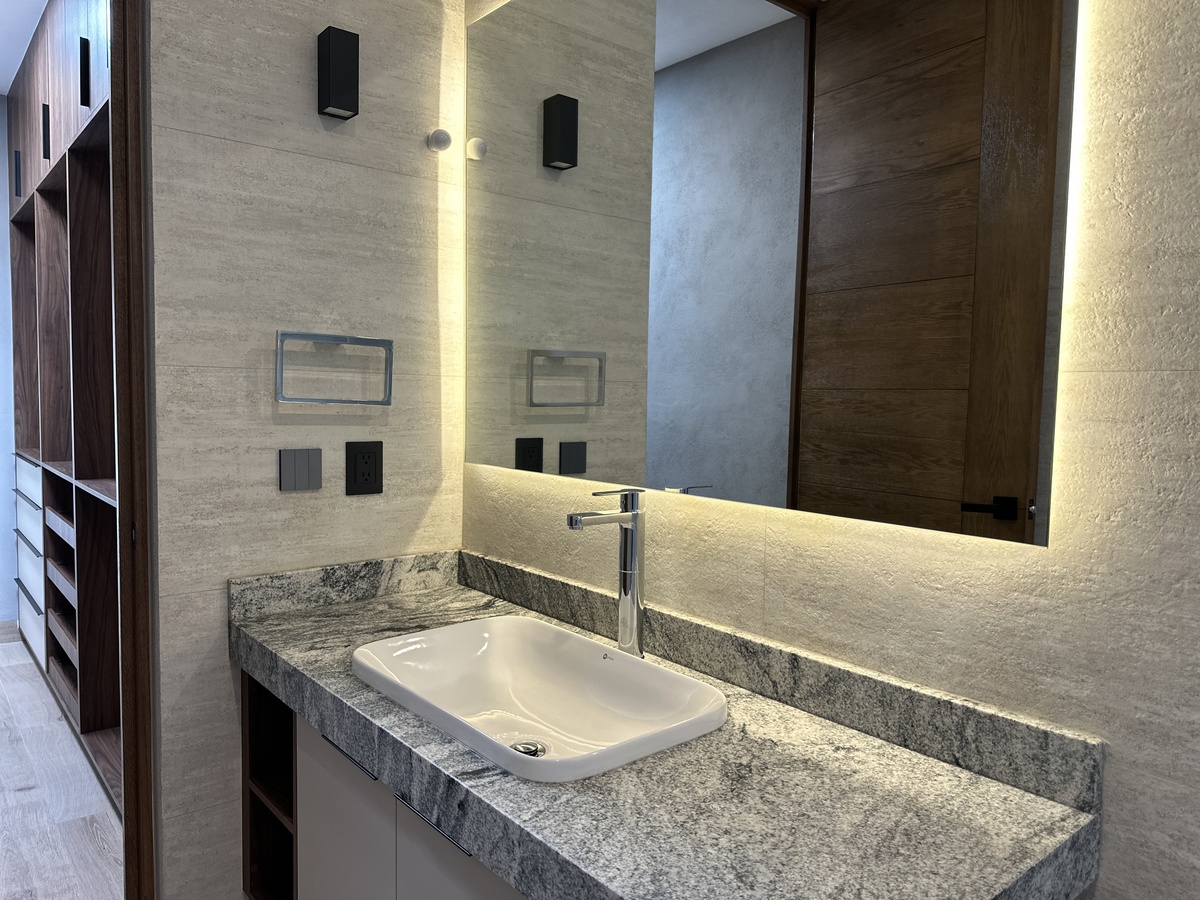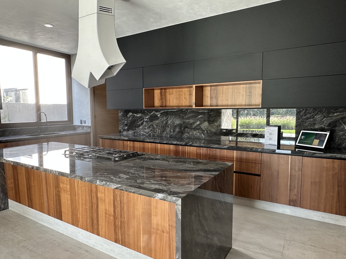 En cuanto a detalles, la casa presenta pisos de porcelanato de gran formato, una escalera de encino con barandal de vidrio templado.