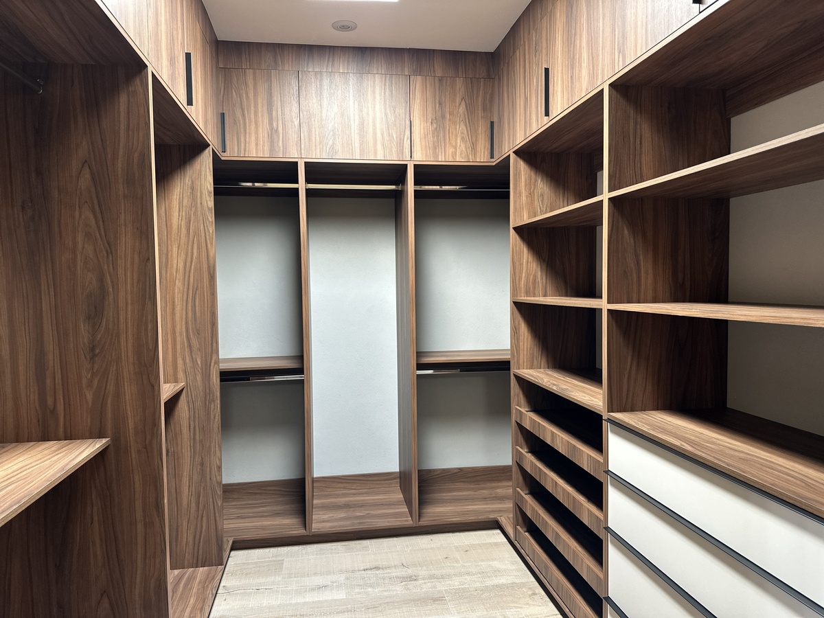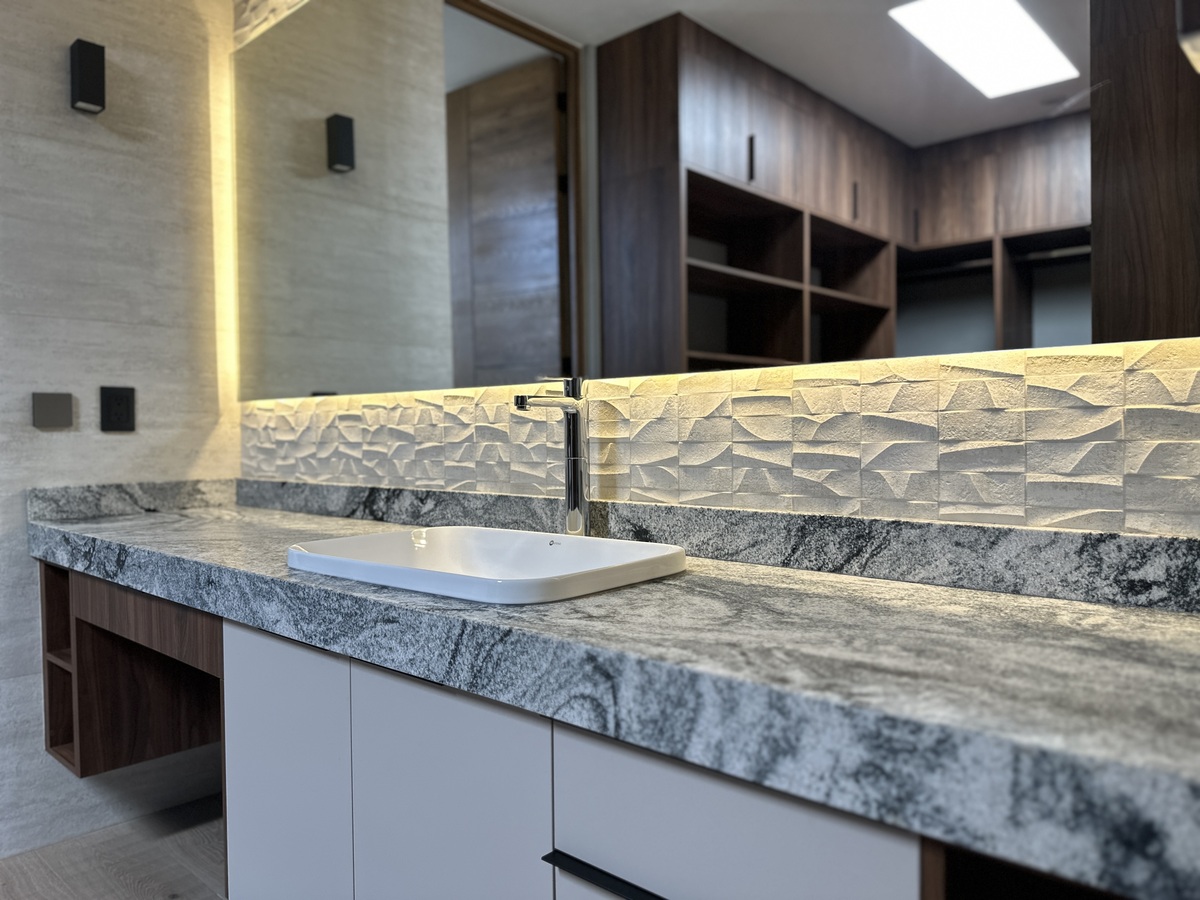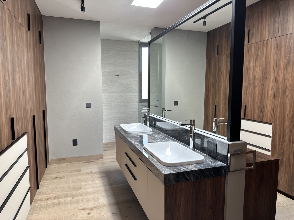 La planta alta ofrece un family room y tres recámaras, cada una con su propio baño. Las dos habitaciones secundarias incluyen walk-in closets, mientras que la principal cuenta con un vestidor amplio y una terraza con vistas abiertas al área verde.