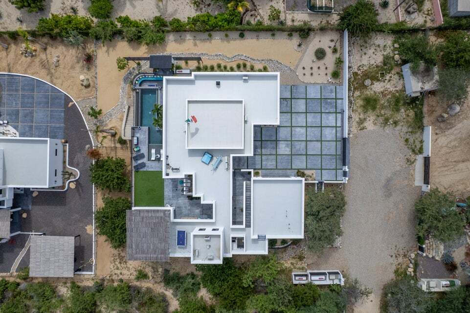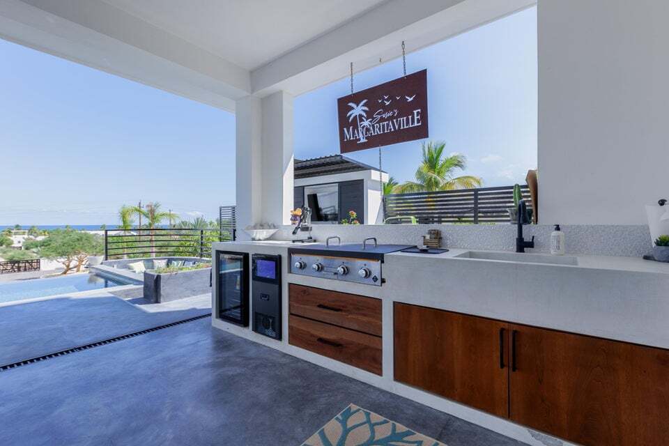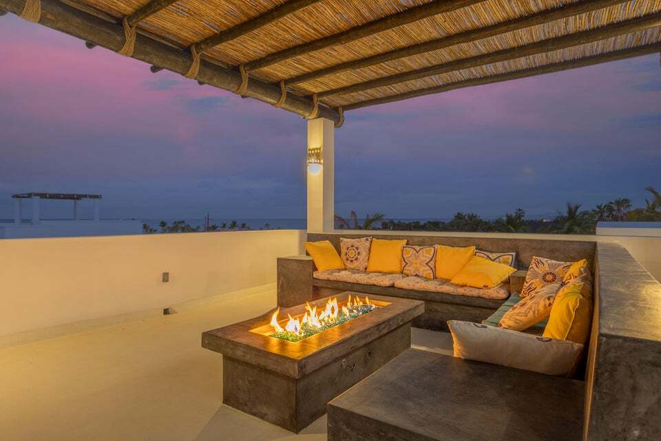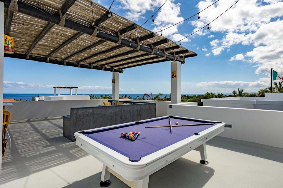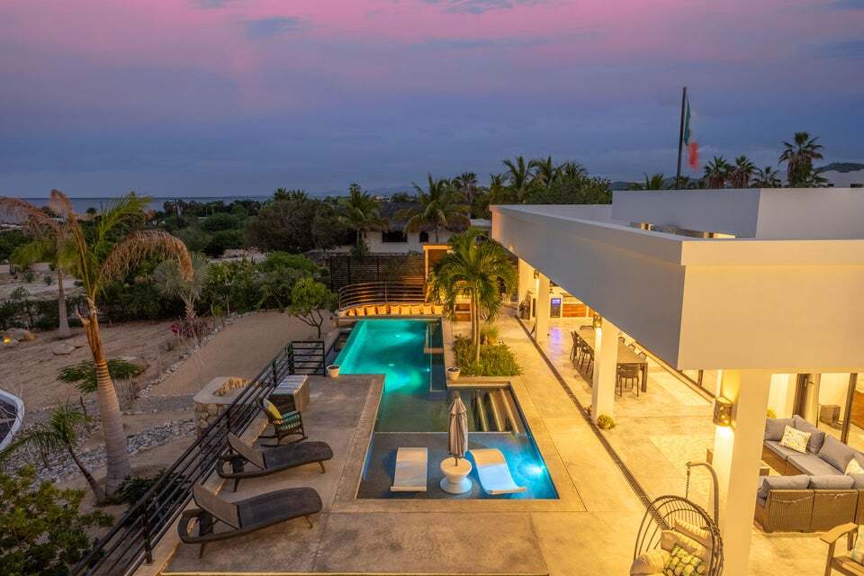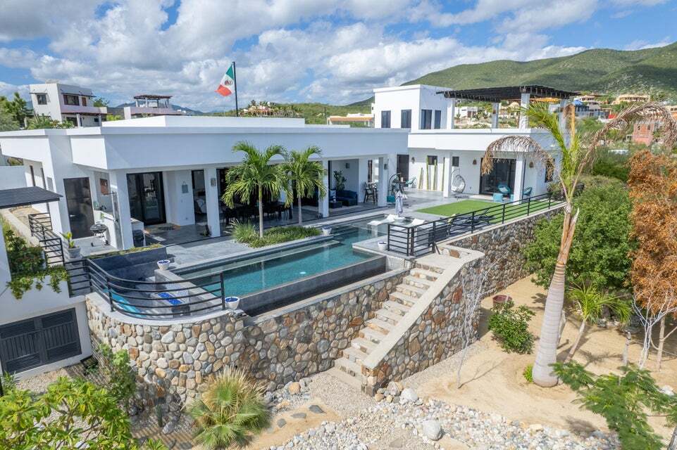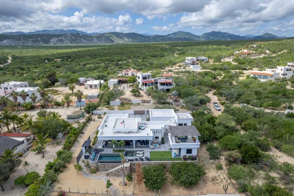 Casa Frazier is a stunning contemporary home located in the desirable Agua de la Costa neighborhood of Los Barriles. Perched on a gentle hillside just 305 meters (.19 miles) from the beach, the property offers sweeping ocean views with quick and easy access to the Sea of Cortez. Built by a reputable local builder with meticulous attention to detail, the residence blends quality craftsmanship with thoughtful design. The main home features two bedrooms and two bathrooms, while two private one-bedroom casitas provide ideal guest accommodations. Above the casitas you'll find the office and a rooftop entertainment area complete with a pool table, shaded lounge, and gas fire pit.