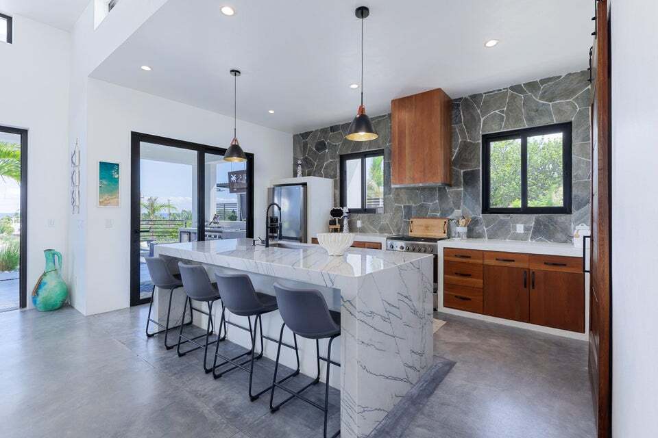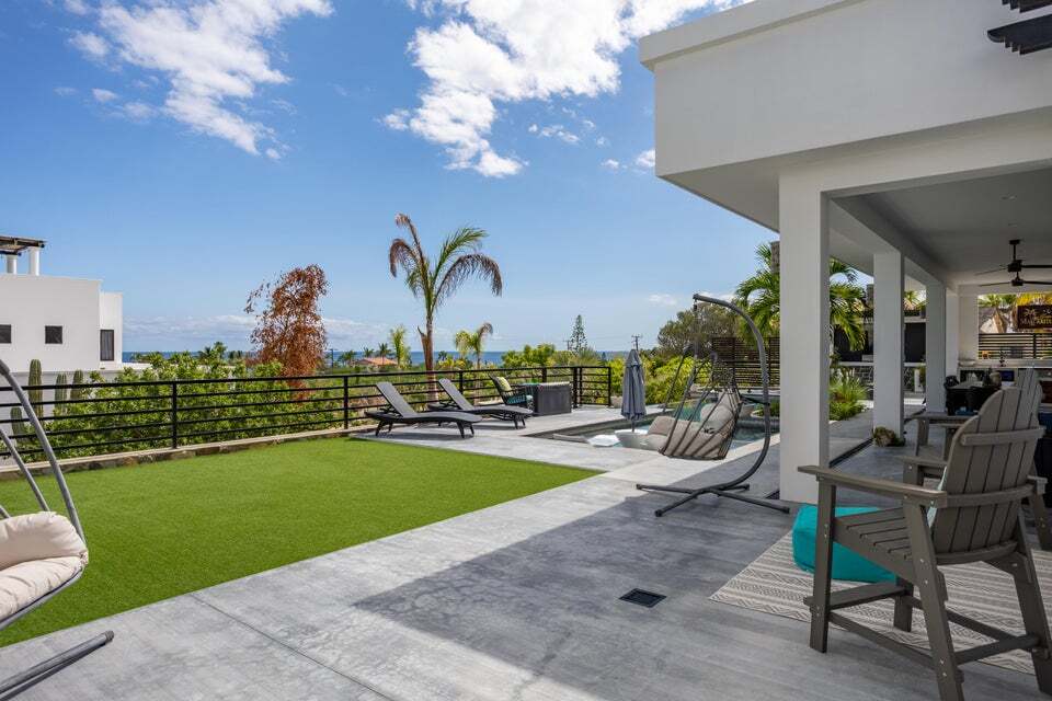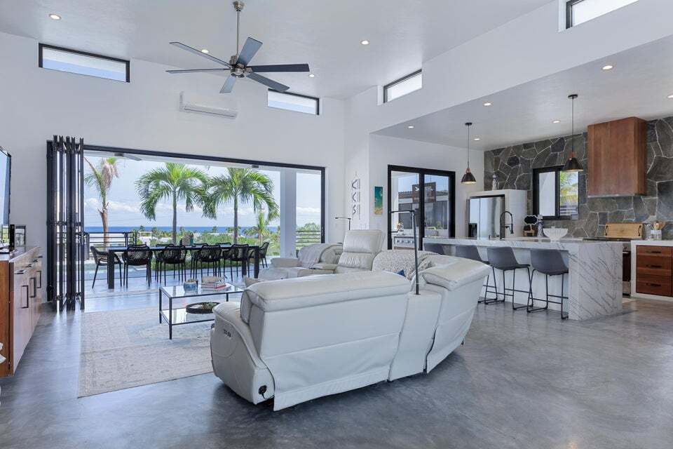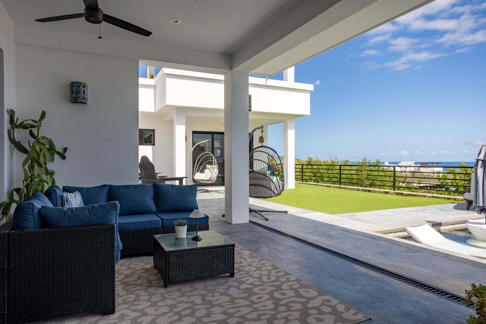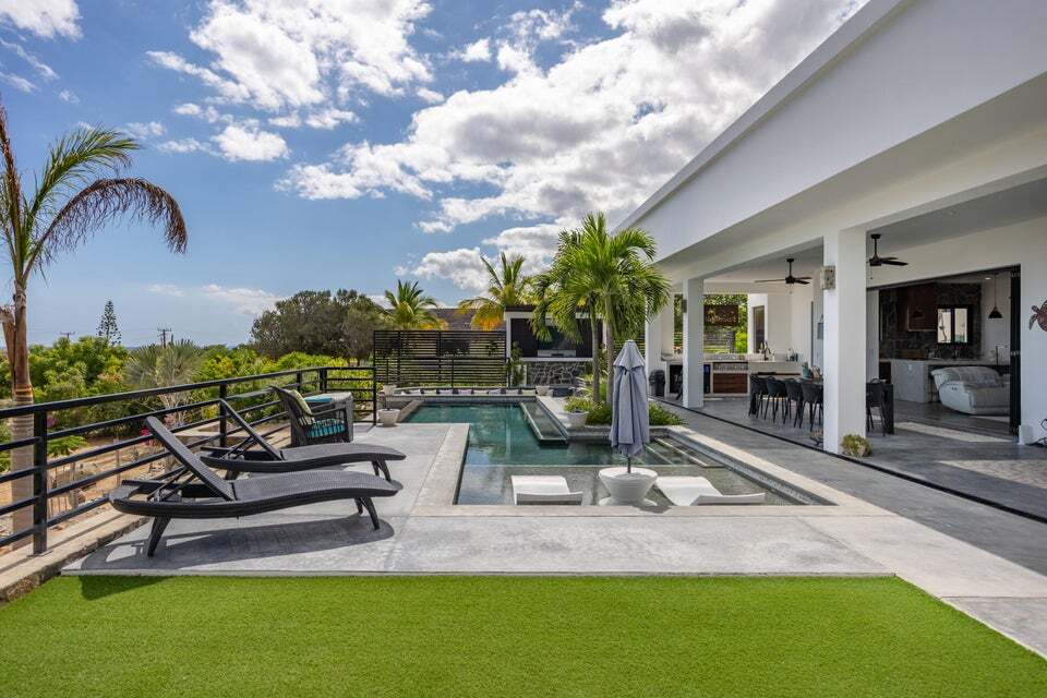 Designed for effortless indoor-outdoor living, the home includes accordion-style glass doors that open the living room to expansive terraces, a beautiful pool, and an outdoor cooking area with ice maker, TV stand, and a second fire pit lounge. Two conveniently located half baths, one by the pool and another upstairs near the entertainment area add to the home's functionality and flow.