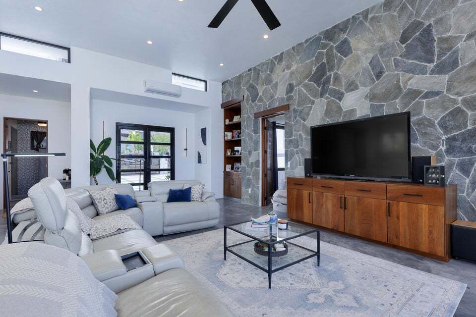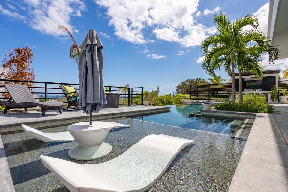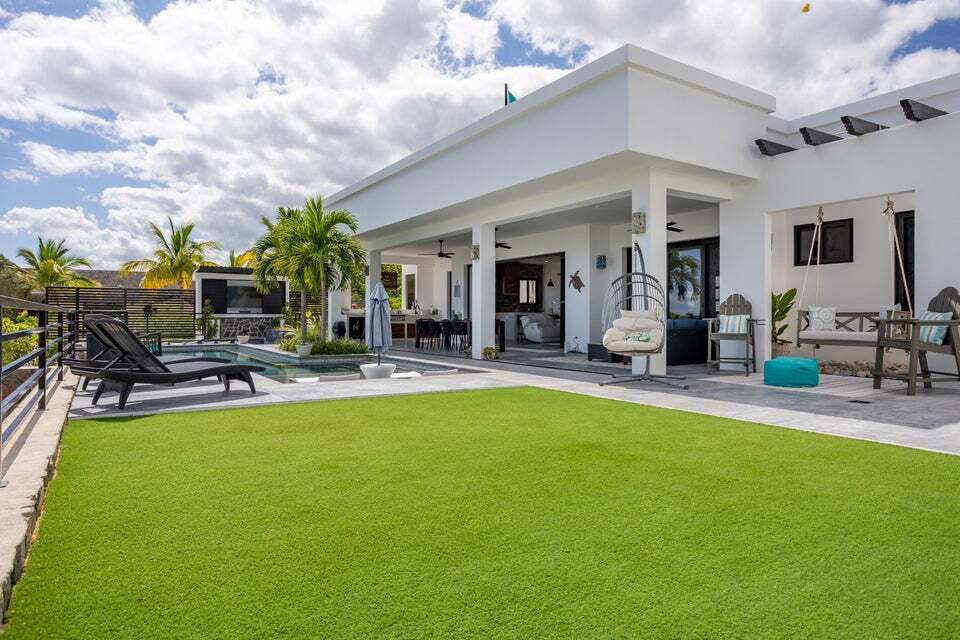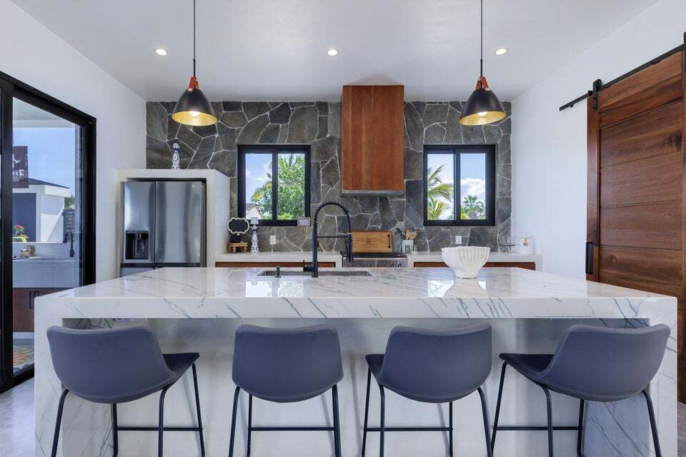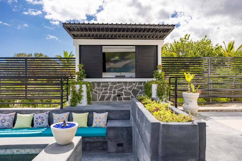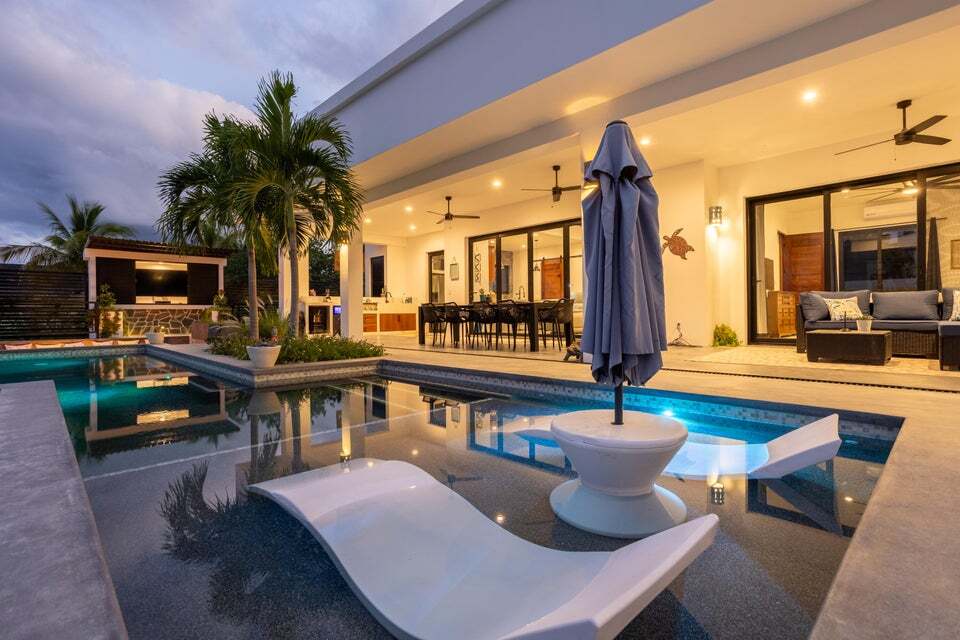 Designed for effortless indoor-outdoor living, the home includes accordion-style glass doors that open the living room to expansive terraces, a beautiful pool, and an outdoor cooking area with ice maker, TV stand, and a second fire pit lounge. Two conveniently located half baths, one by the pool and another upstairs near the entertainment area add to the home's functionality and flow.