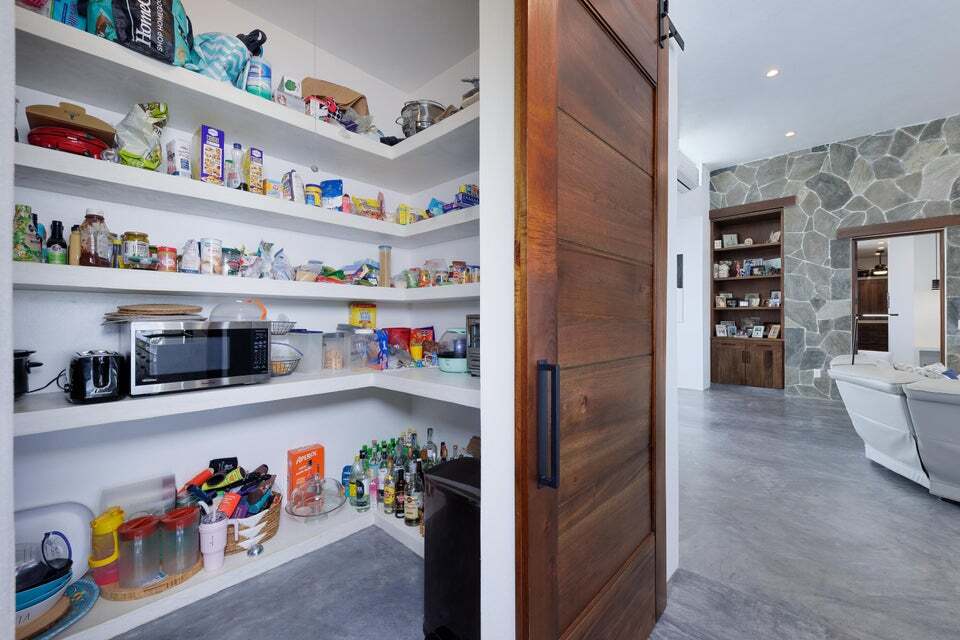 gate, garden irrigation system, mature landscaping, and a walk-in pantry designed to store small appliances and maintain a clean kitchen aesthetic.