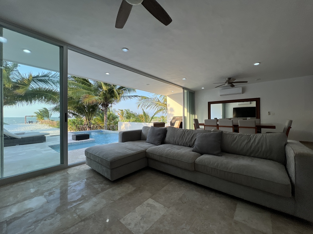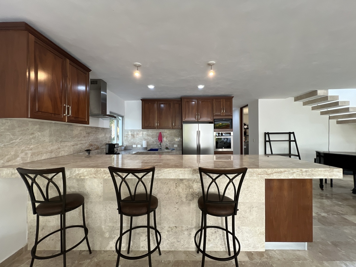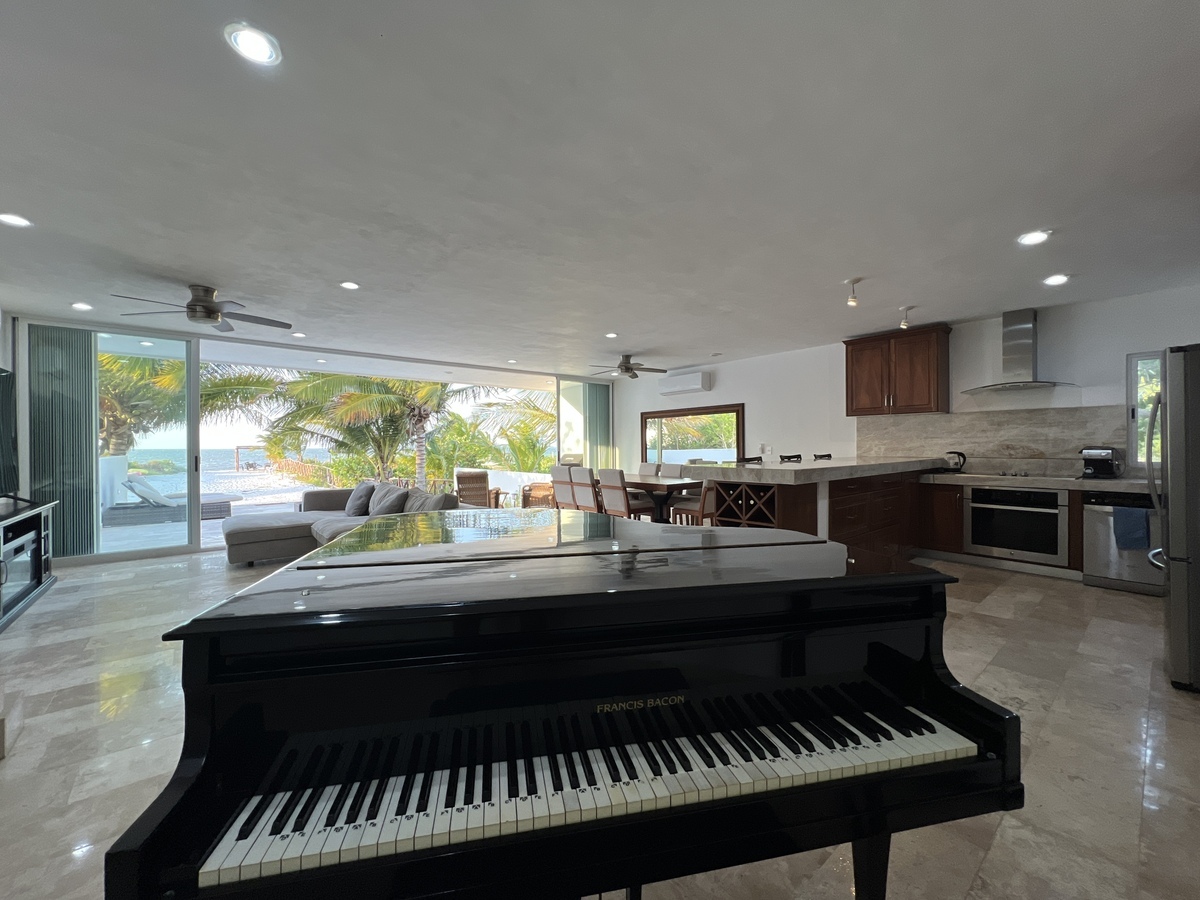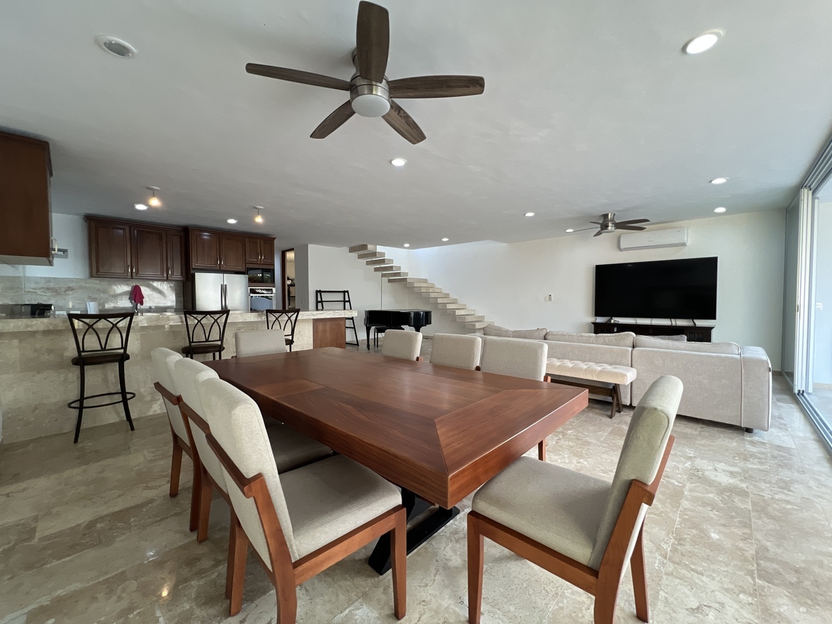 La cocina, sala y comedor, ofrecen impresionantes vistas al mar, creando un ambiente perfecto para disfrutar del paisaje. Estos espacios están diseñados con un concepto abierto, lo que les da una sensación de amplitud y luminosidad. Desde aquí, accedes a una extensa área de terraza, donde se encuentra la alberca y el acceso a la playa.