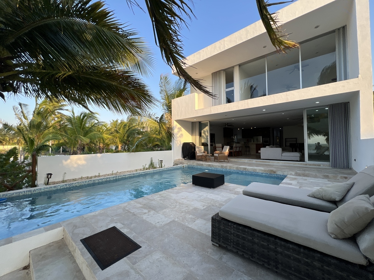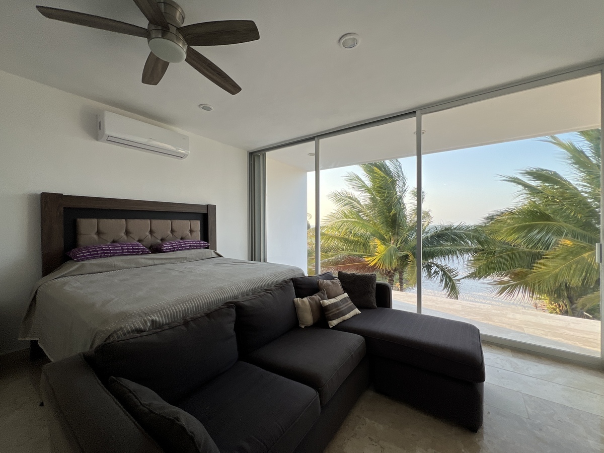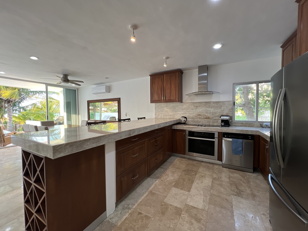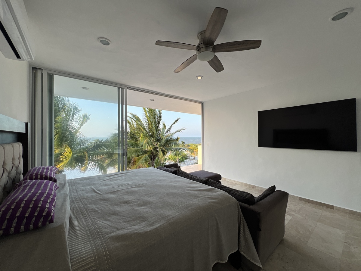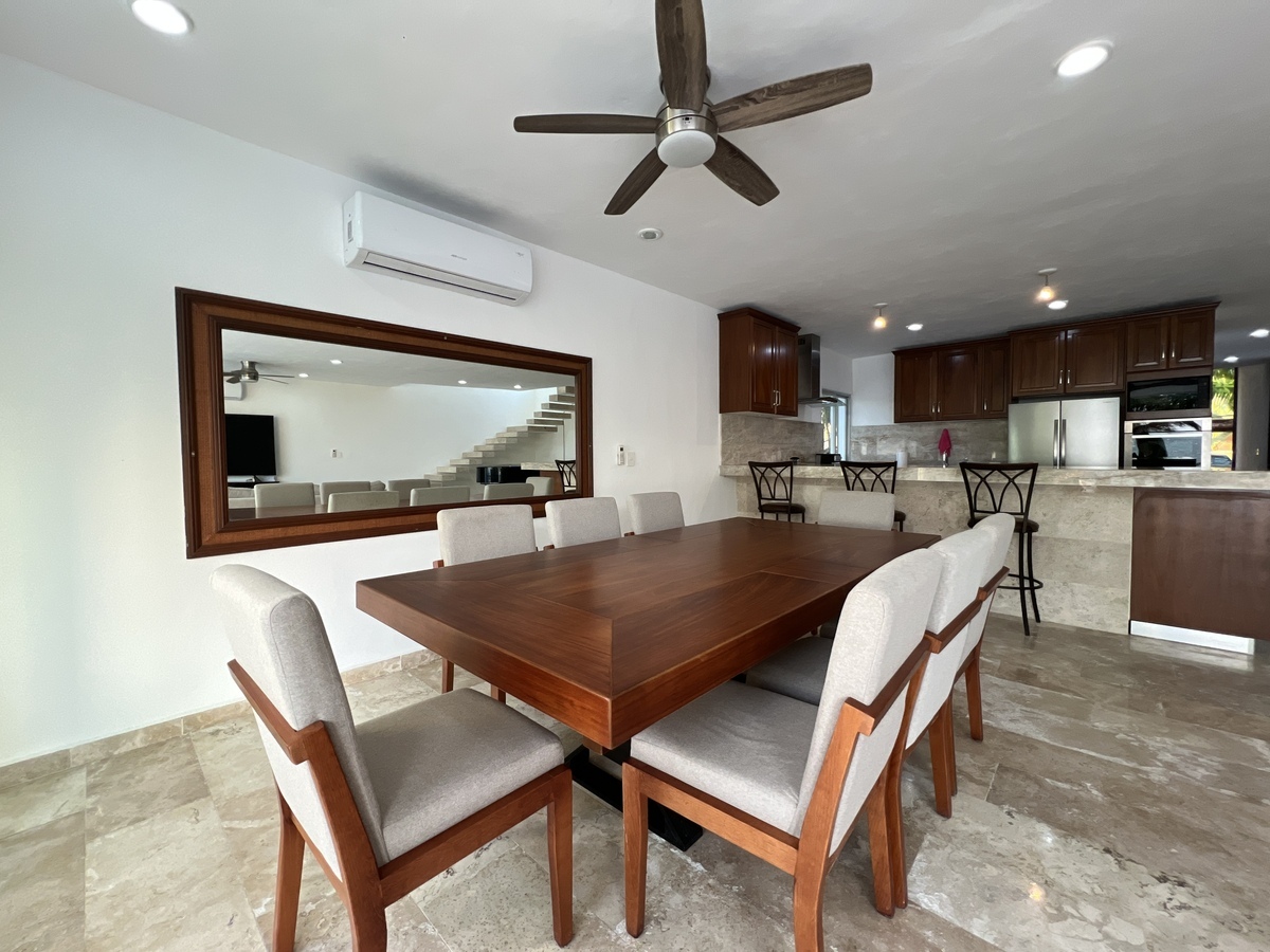La cocina, sala y comedor, ofrecen impresionantes vistas al mar, creando un ambiente perfecto para disfrutar del paisaje. Estos espacios están diseñados con un concepto abierto, lo que les da una sensación de amplitud y luminosidad. Desde aquí, accedes a una extensa área de terraza, donde se encuentra la alberca y el acceso a la playa.