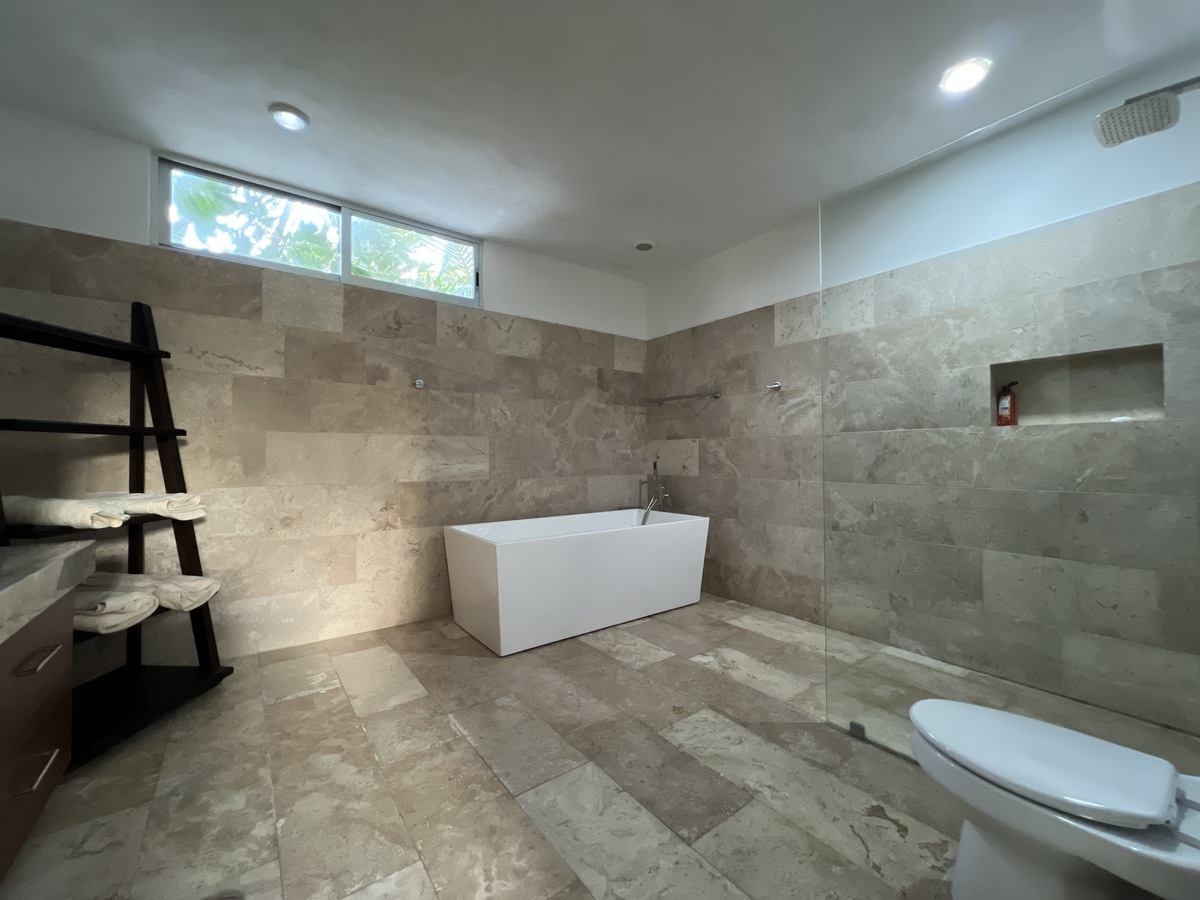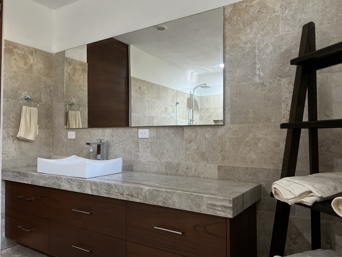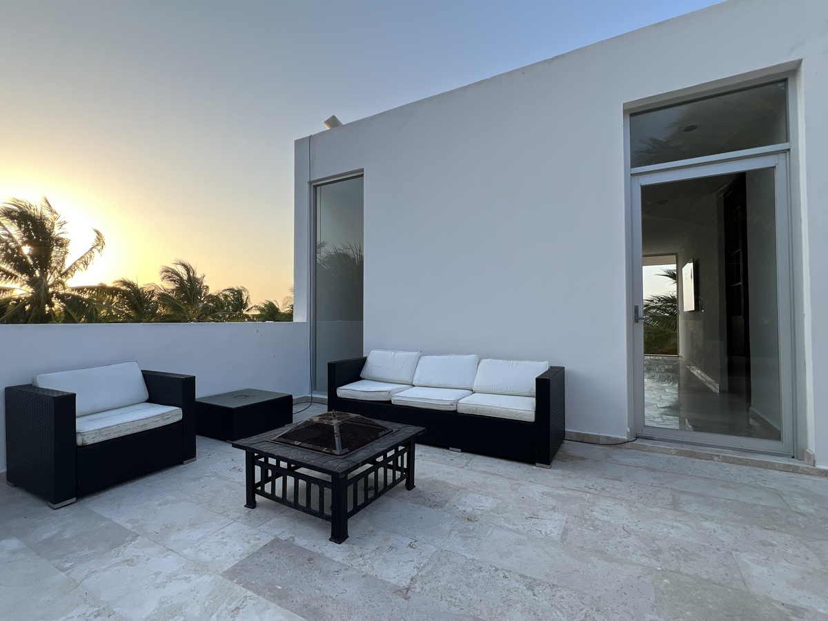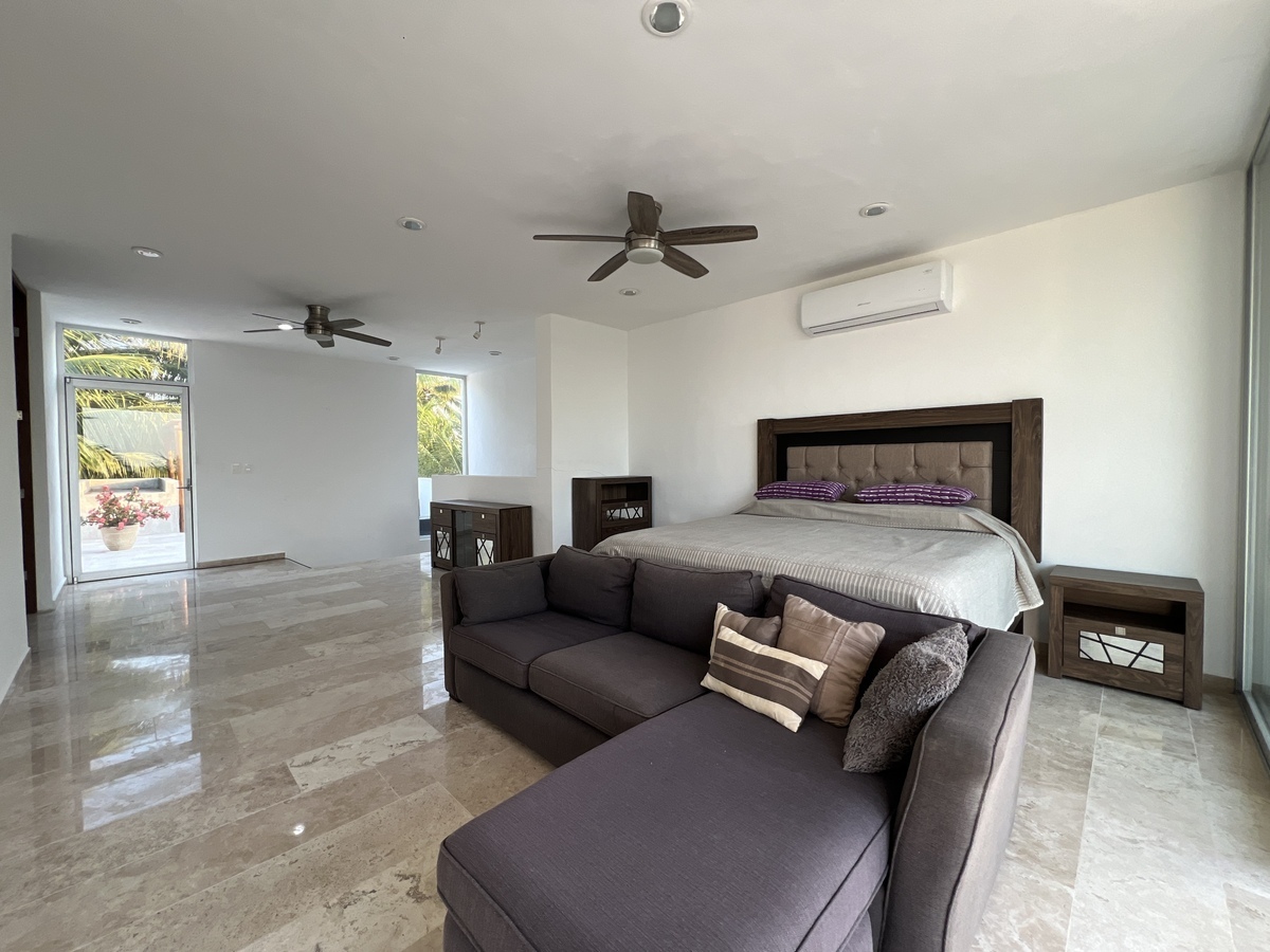 La cocina, sala y comedor, ofrecen impresionantes vistas al mar, creando un ambiente perfecto para disfrutar del paisaje. Estos espacios están diseñados con un concepto abierto, lo que les da una sensación de amplitud y luminosidad. Desde aquí, accedes a una extensa área de terraza, donde se encuentra la alberca y el acceso a la playa.