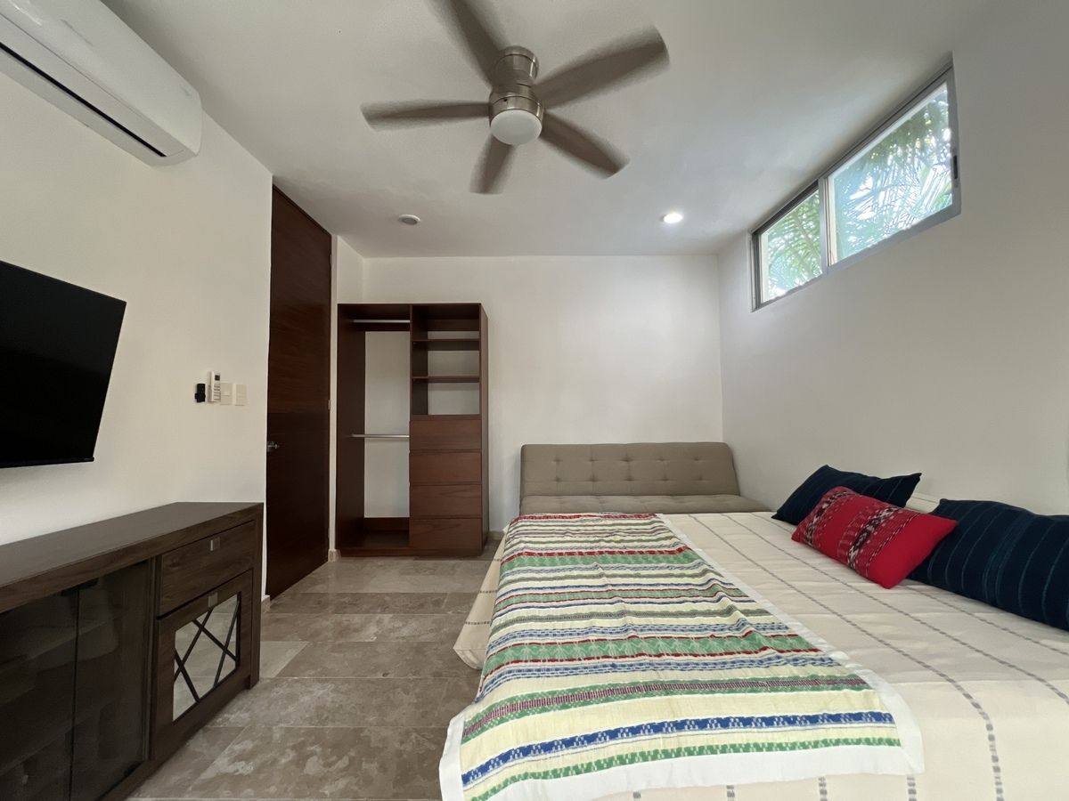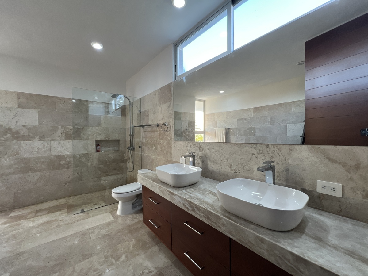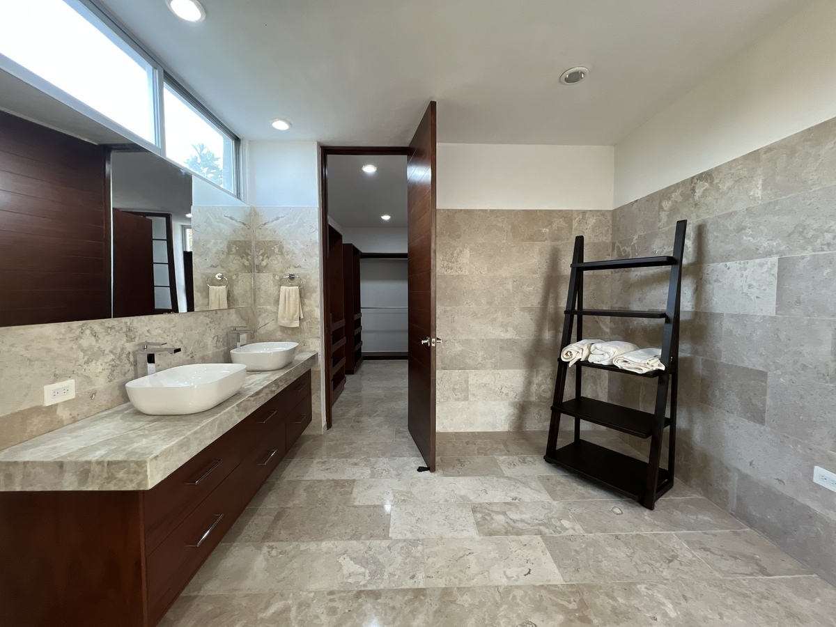 La casa tiene tres recámaras, todas diseñadas para maximizar el confort y las vistas. La recámara principal se encuentra en la planta alta, con un baño completo, clóset y vestidor, una sala privada, un balcón y una amplia terraza. Las otras dos recámaras están en planta baja, ideales para huéspedes o familia.