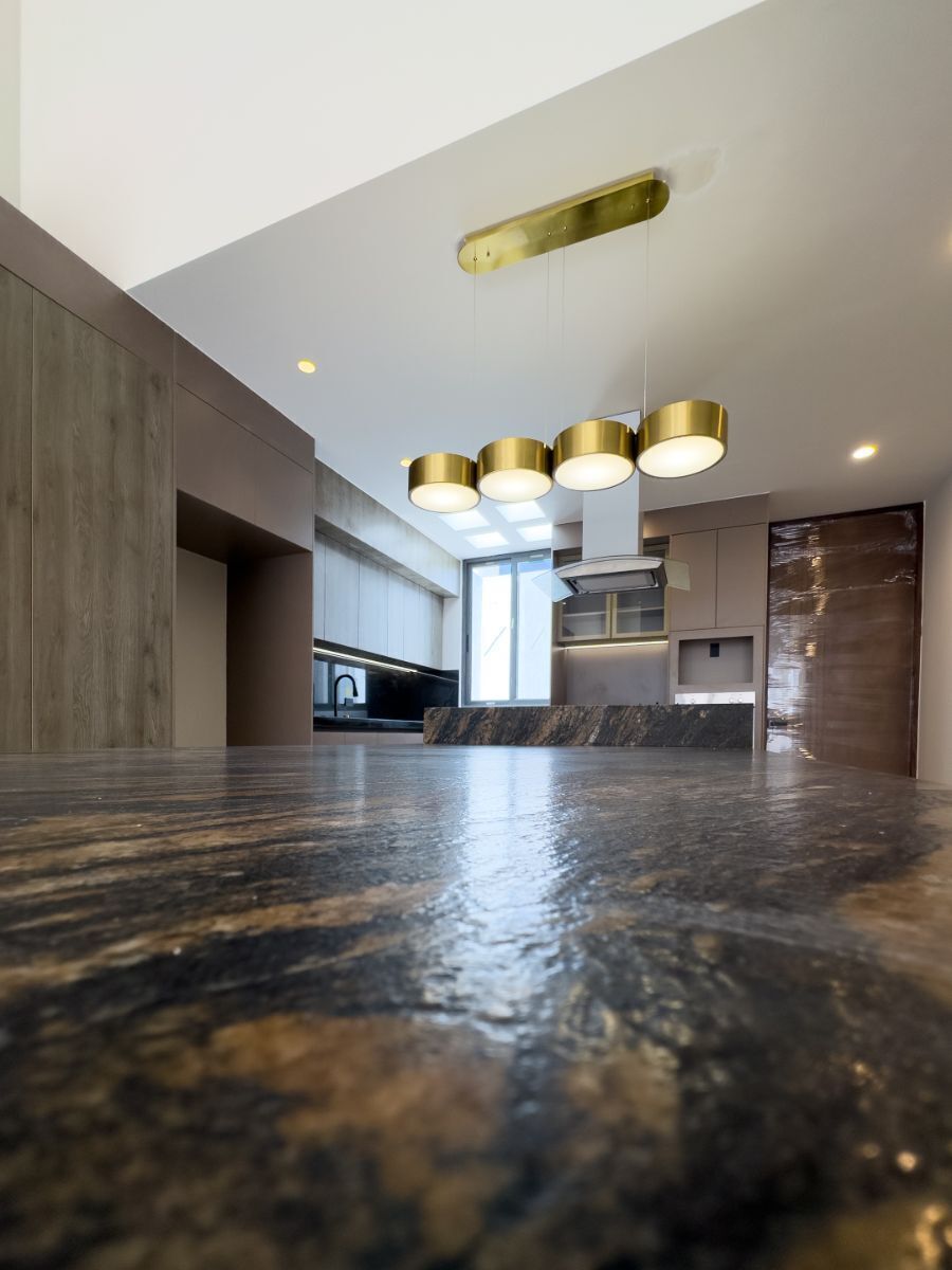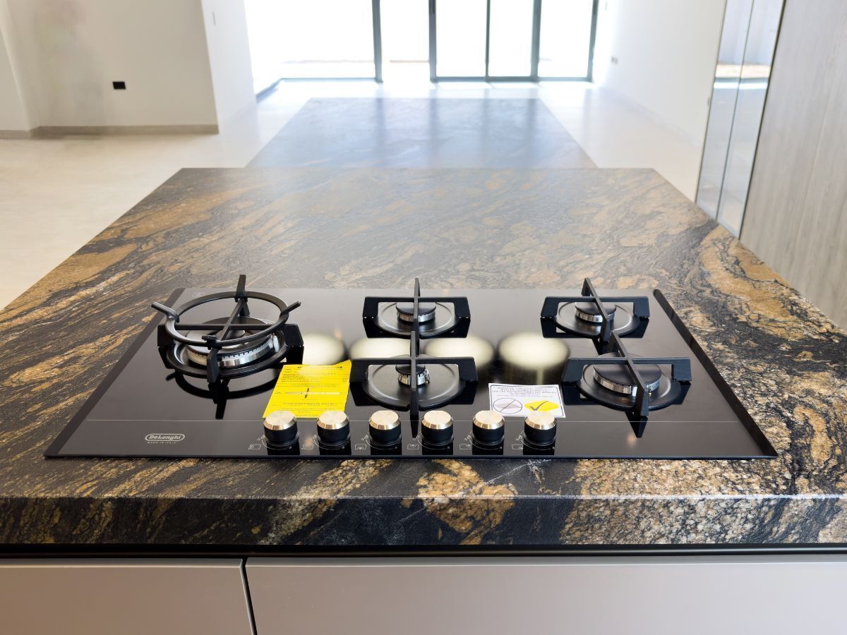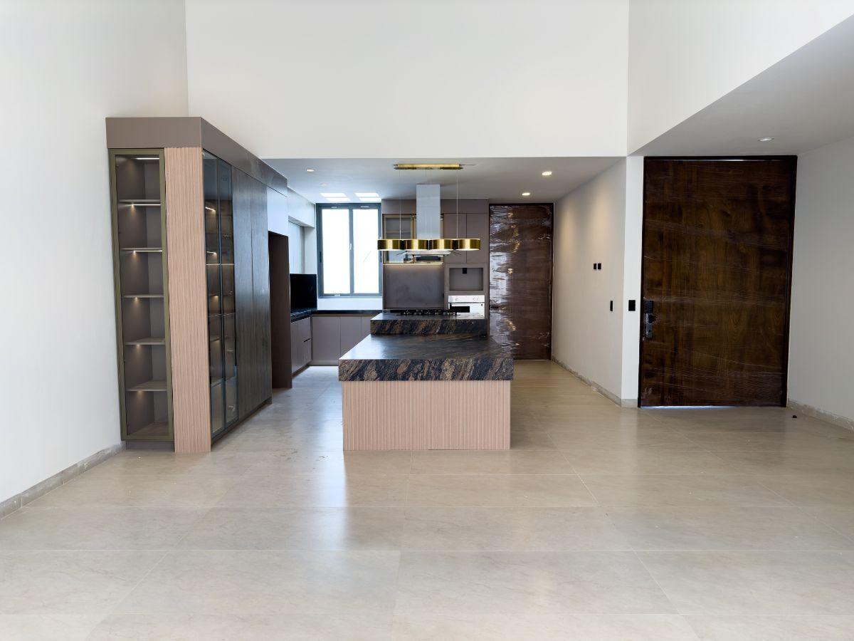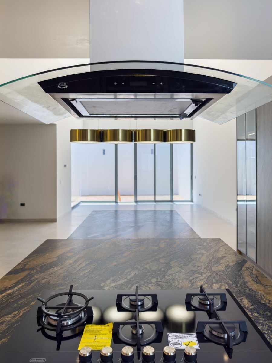 - Cocina plus con barra tipo comedor para 6 personas con granito exótico golden black, parrilla de vidrio templado y paneles de vidrio con iluminación led.