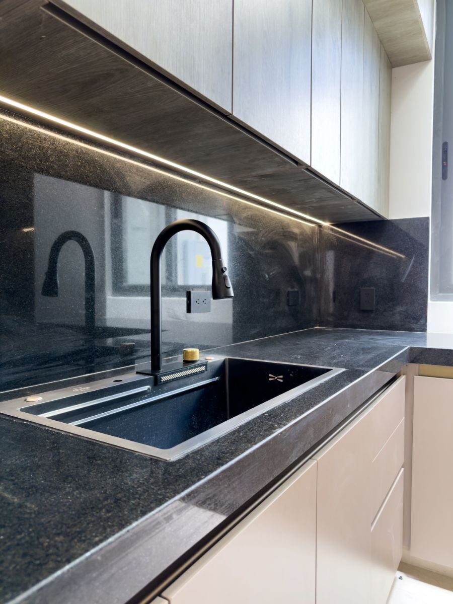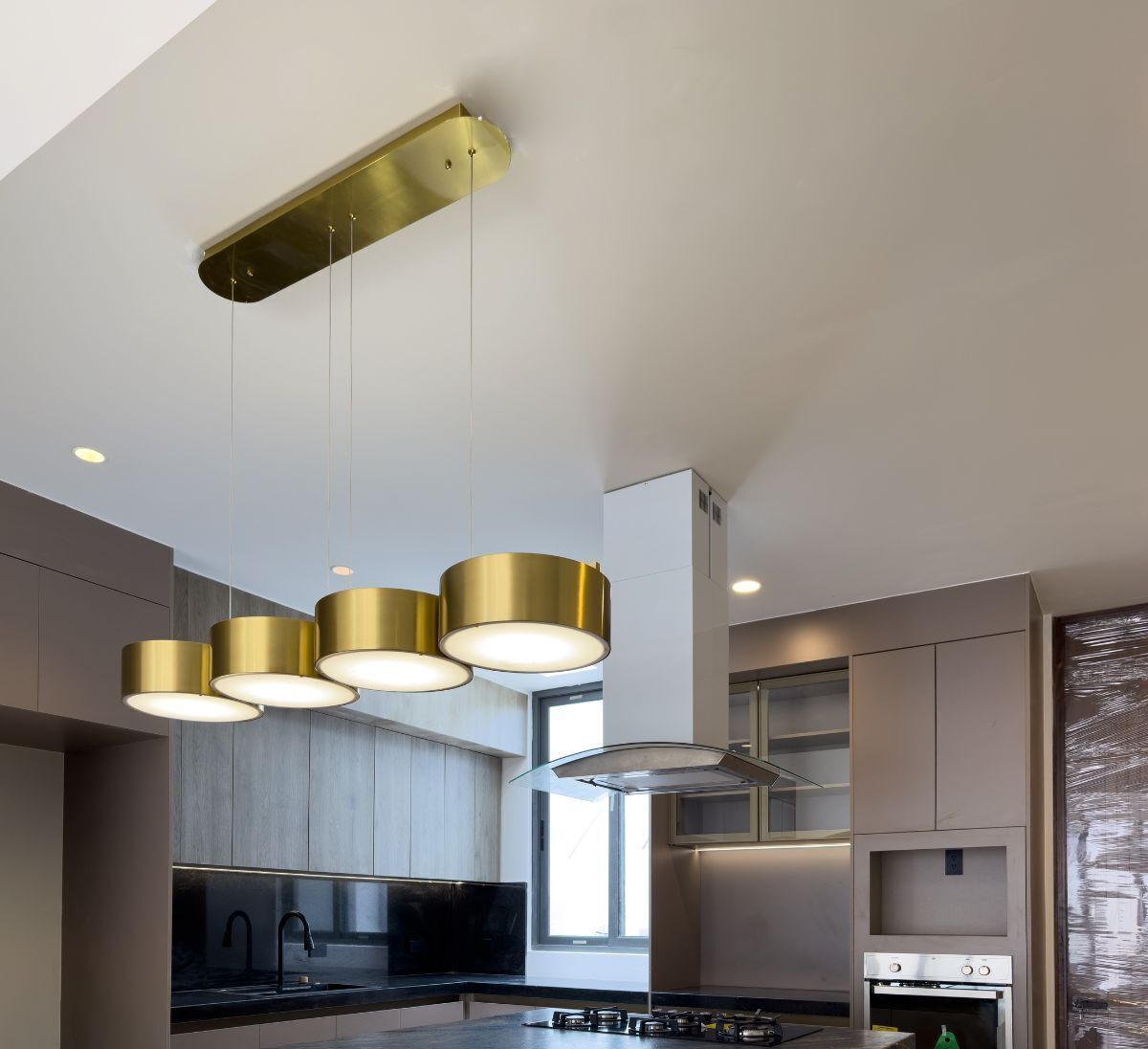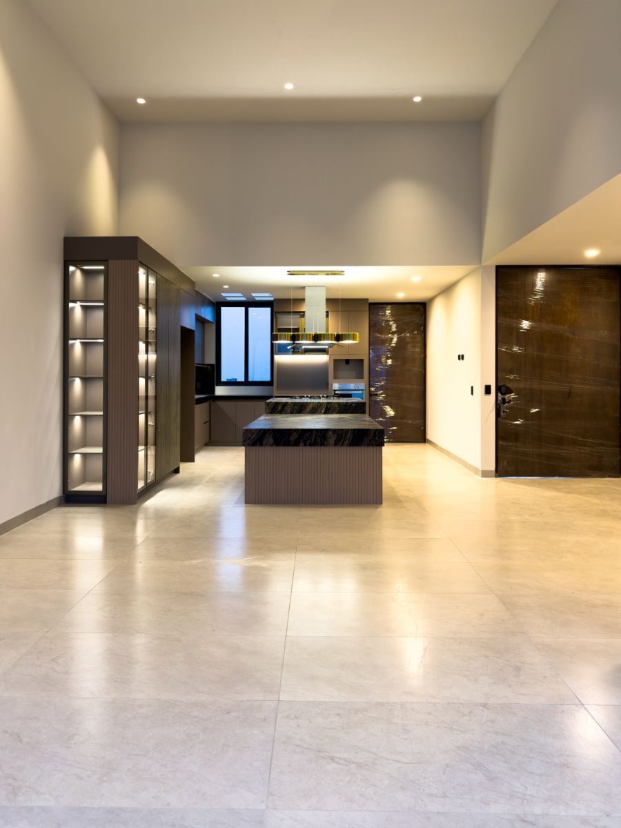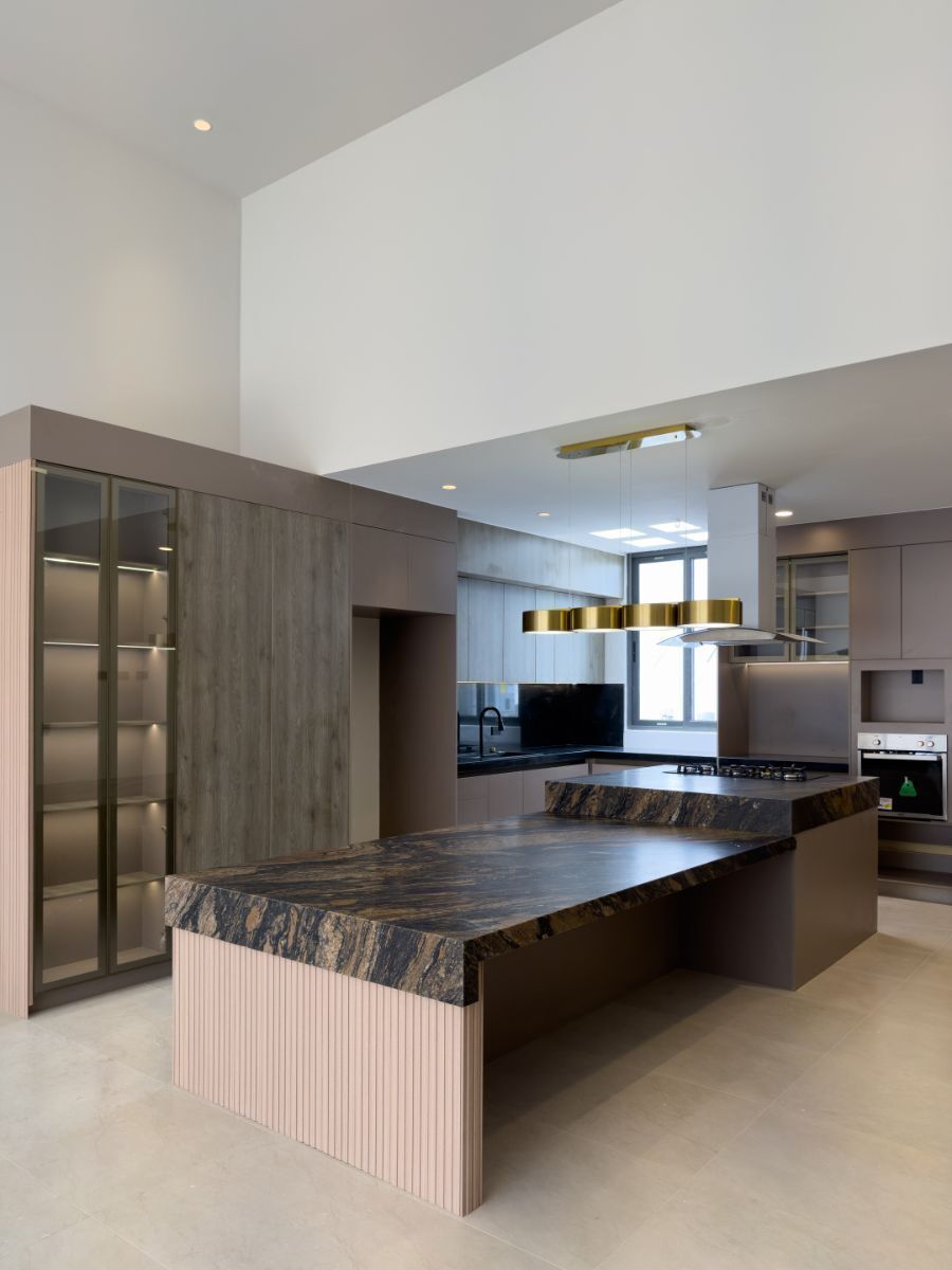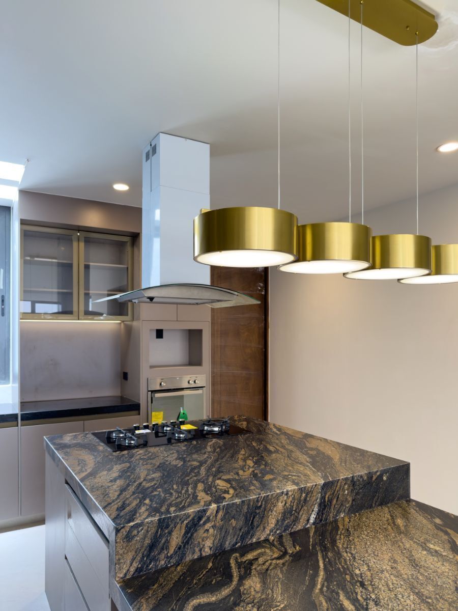 - Cocina plus con barra tipo comedor para 6 personas con granito exótico golden black, parrilla de vidrio templado y paneles de vidrio con iluminación led.