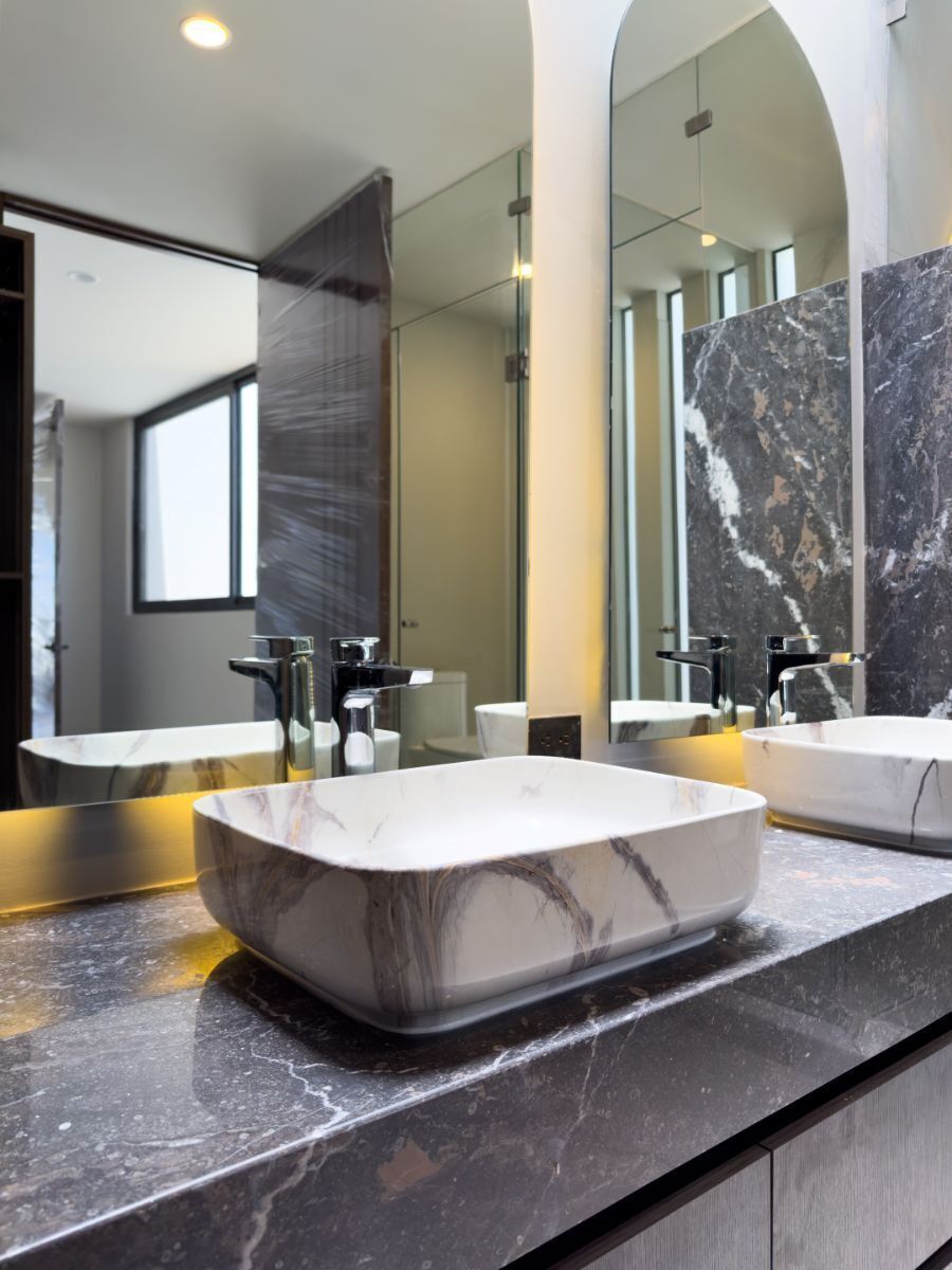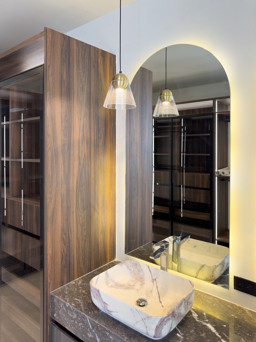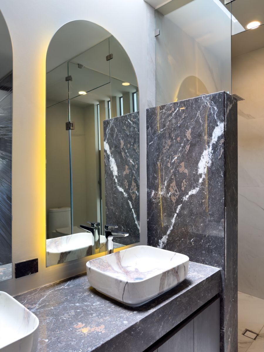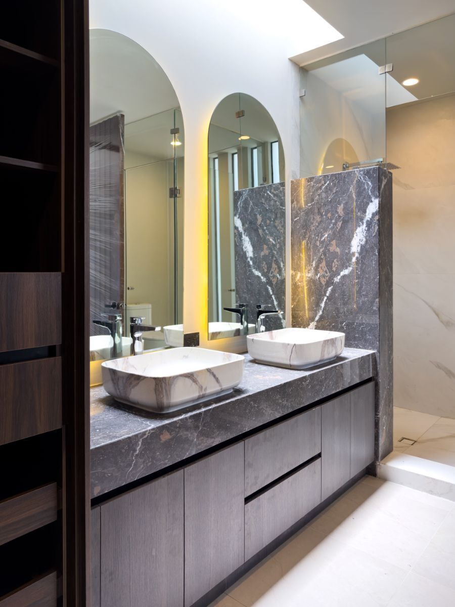 - Cocina plus con barra tipo comedor para 6 personas con granito exótico golden black, parrilla de vidrio templado y paneles de vidrio con iluminación led.