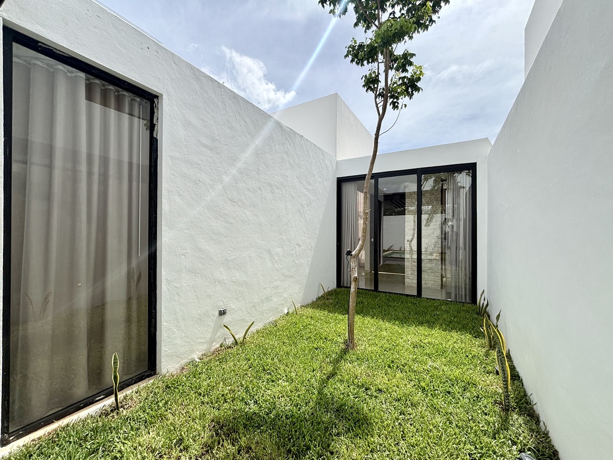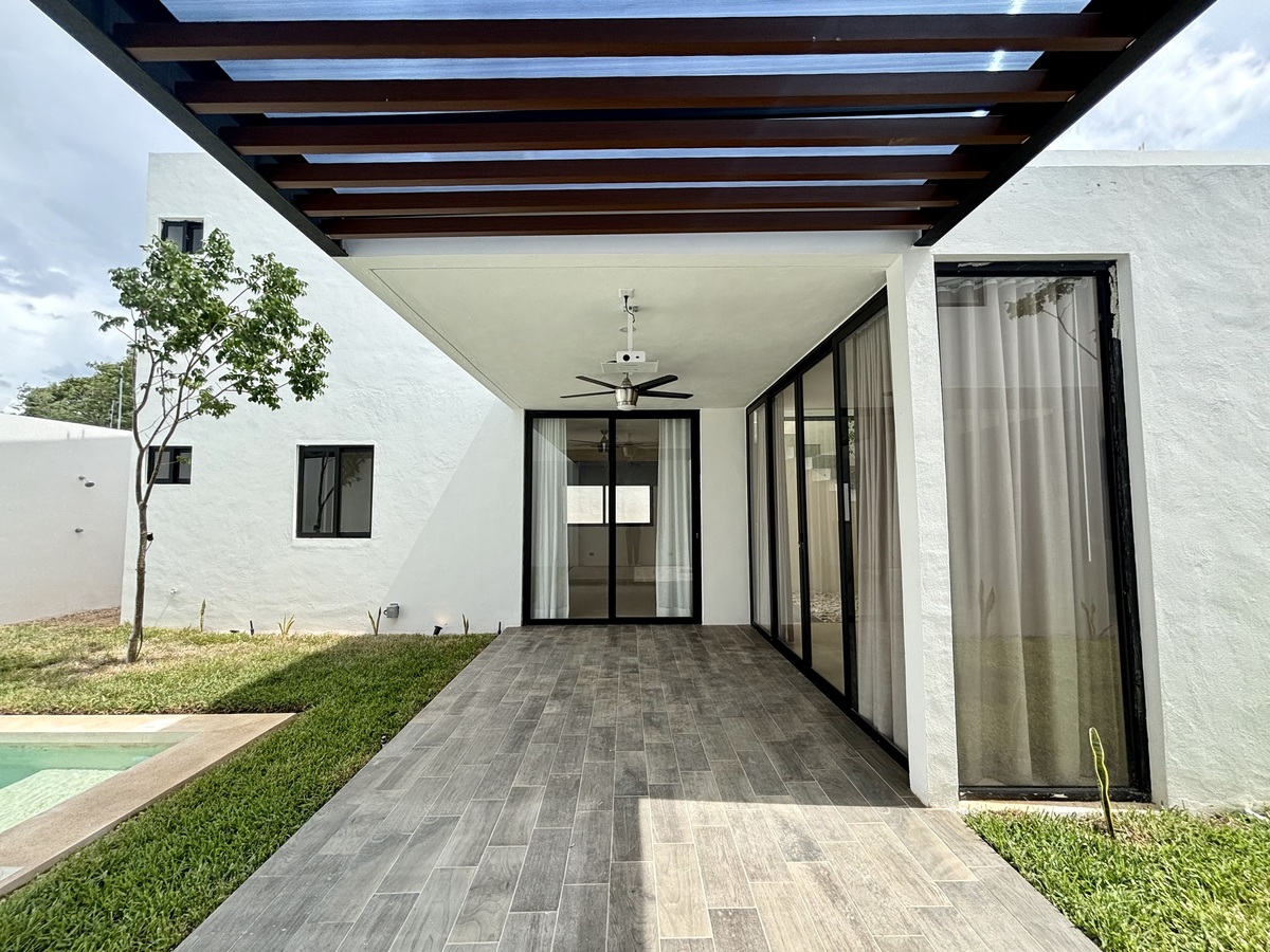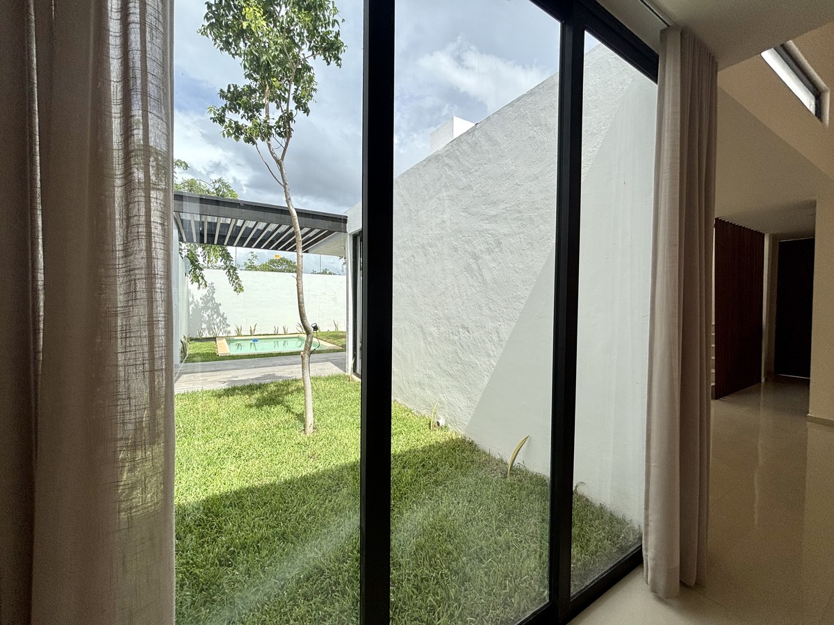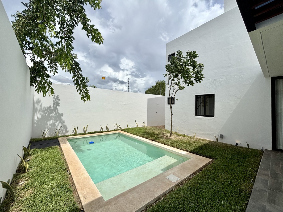 - Alberca con acabado chukum y áreas de pasto en rollo en el jardín
