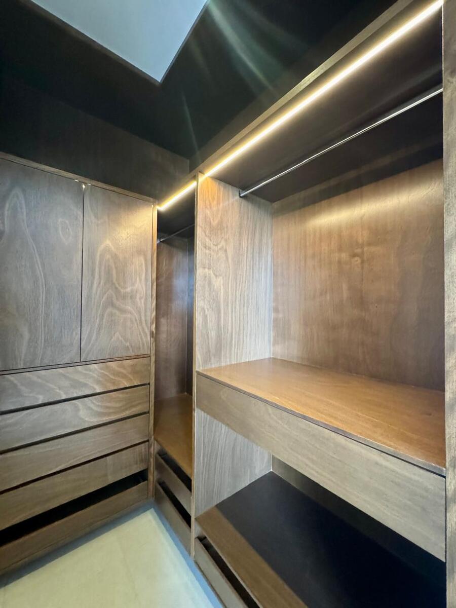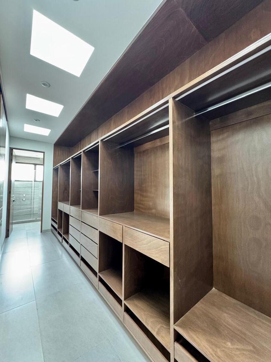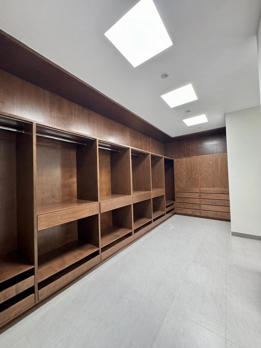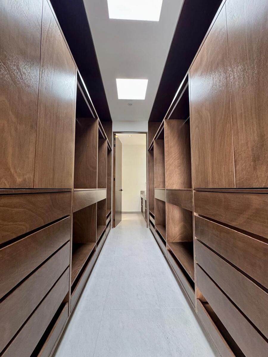Papel tapiz en muros, cantera, madera, mármol y vestidores de madera con luz indirecta, entre otros.