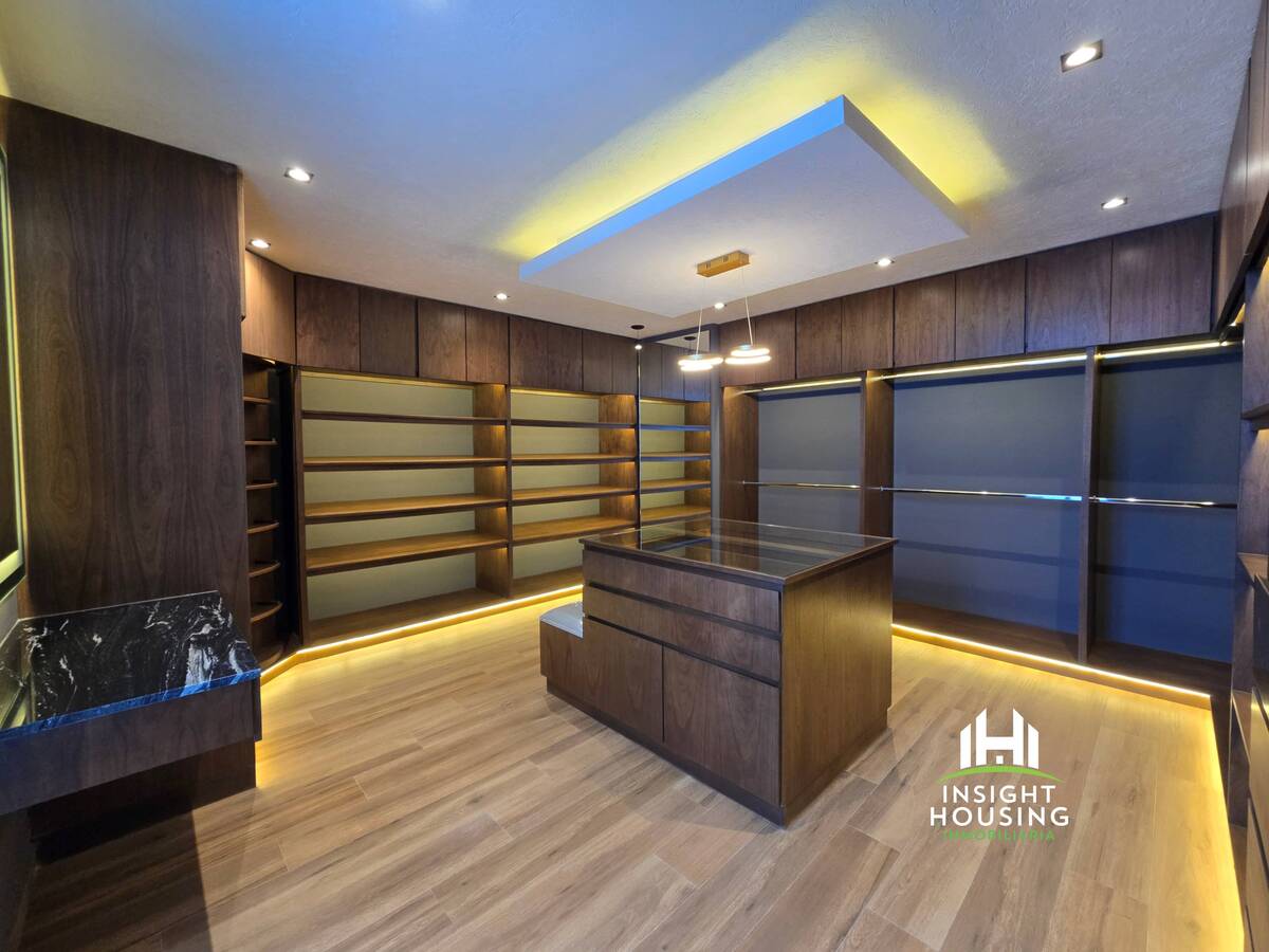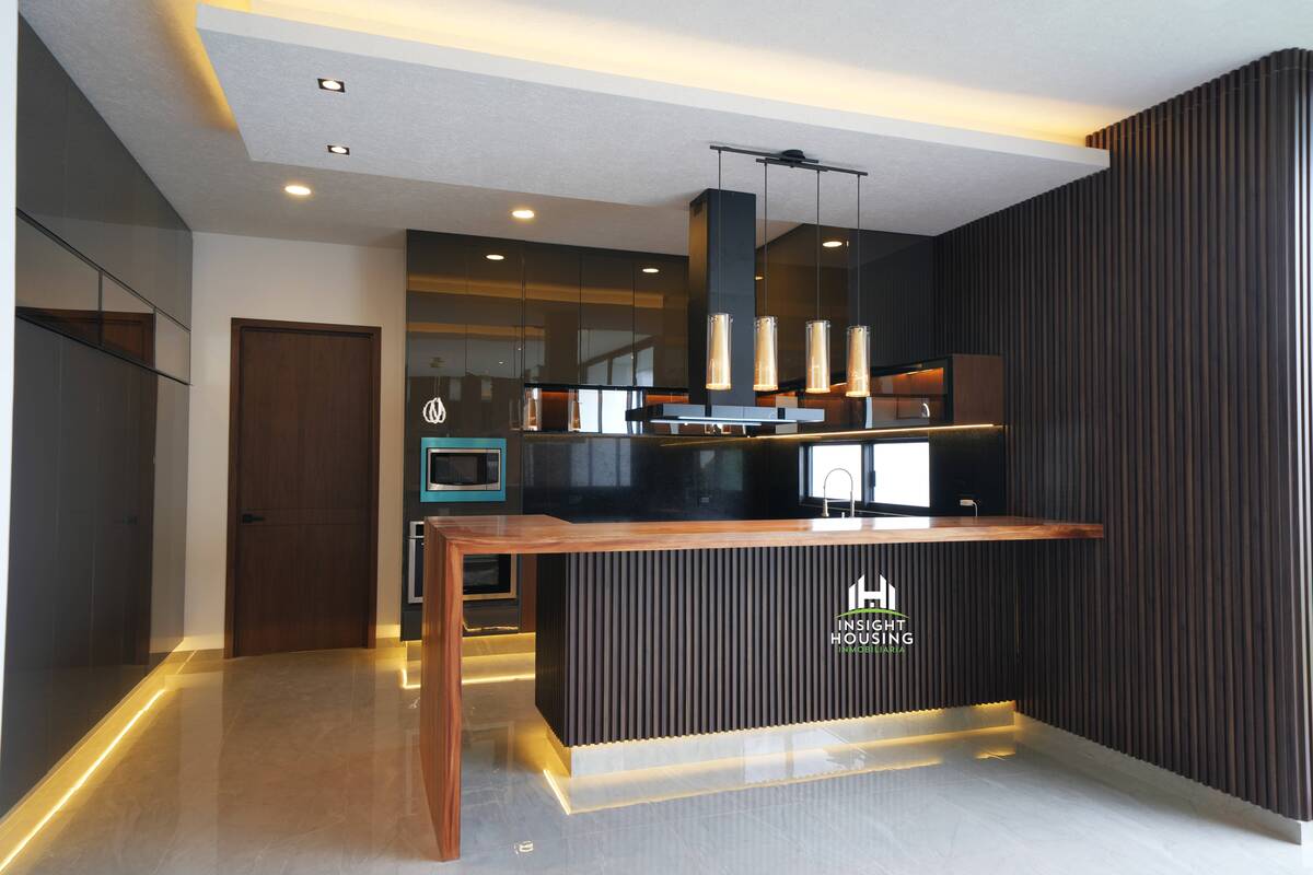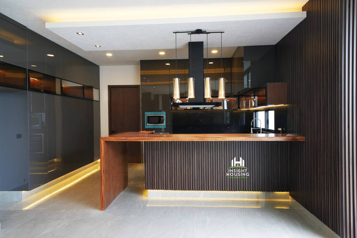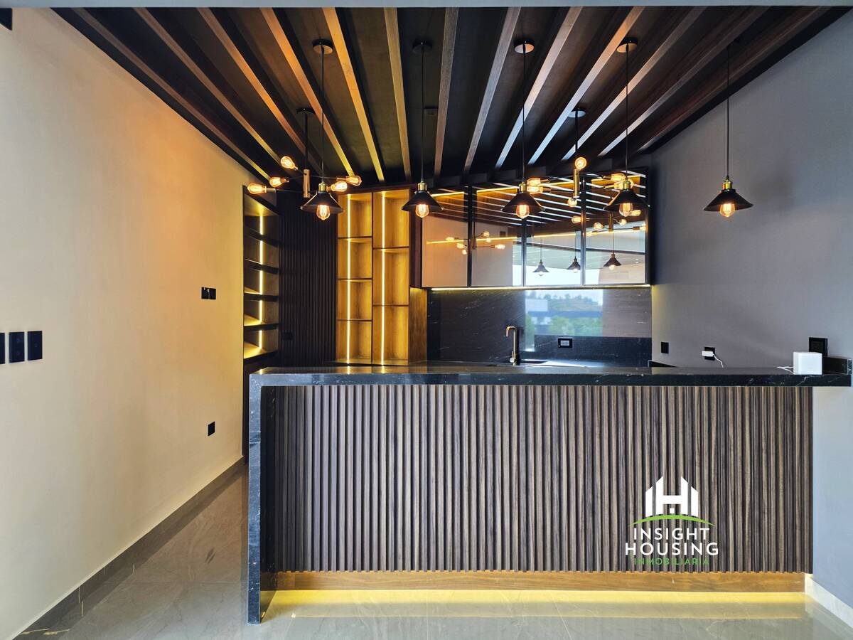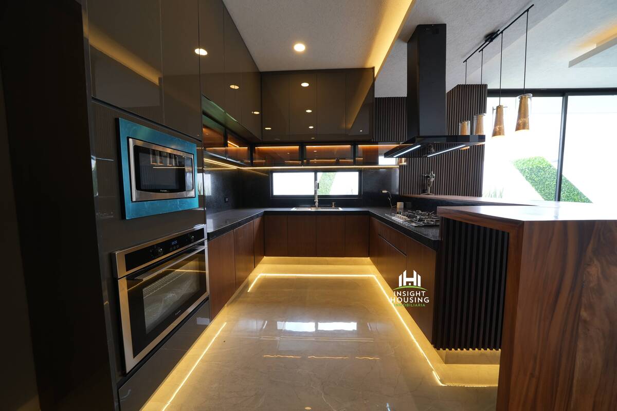 COCINA AL ALTO BRILLO CON ILUMNACION INDIRECTA Y DESAYUNADOR EN MADERA DE PAROTA, EQUIPOS DE COCINA DE ALTA GAMA INCLUYE LAVAJALLAS DE EMPOTRE FORRADA EN MADERA Y CUARTO DE ALACENA.