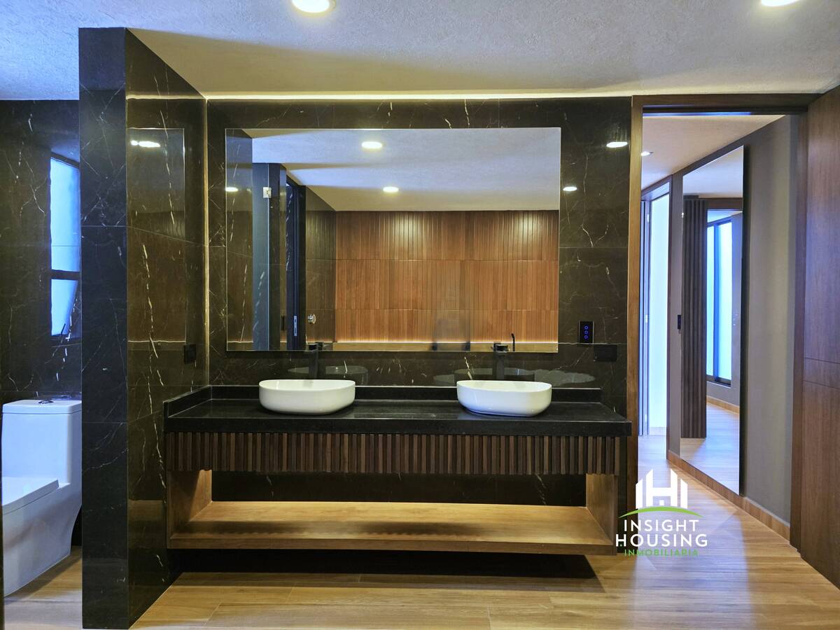 RECAMARA PRINCIPAL CON TERRAZA, MUEBLE DE TV, 2 VESTIDORES PARA EL Y ELLA CADA UNO CON TOCADORES, ESPEJOS DE VANIDAD, ESPEJOS DE CUERPO COMPLETO ISLAS Y ZAPATERAS, BAÑO COMPLETO CON DOBLE LAVABO, TINA DE BAÑO, TORRE DE REGADERA CON VAPOR EQUIPO INCLUIDO, Y WC INDEPENDIENTE.