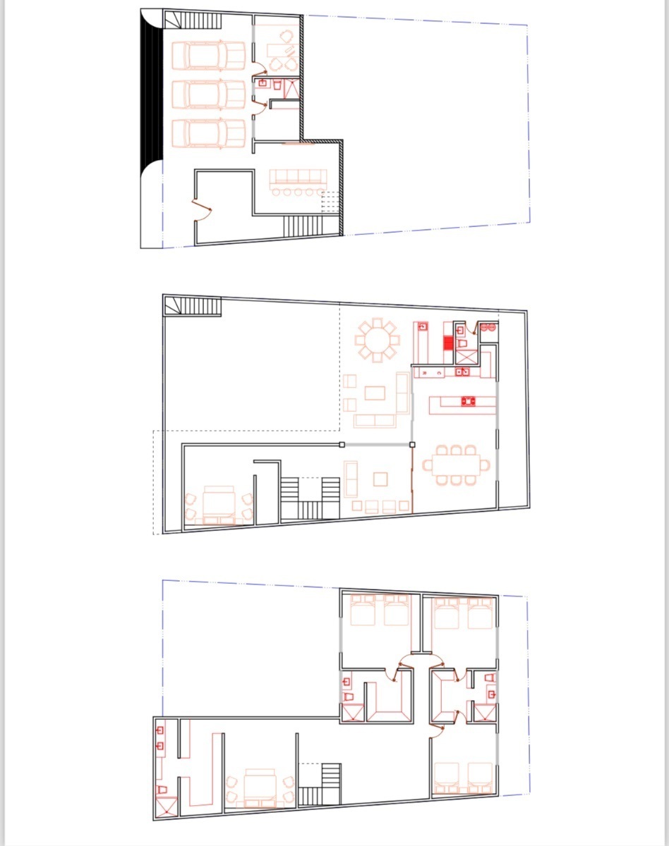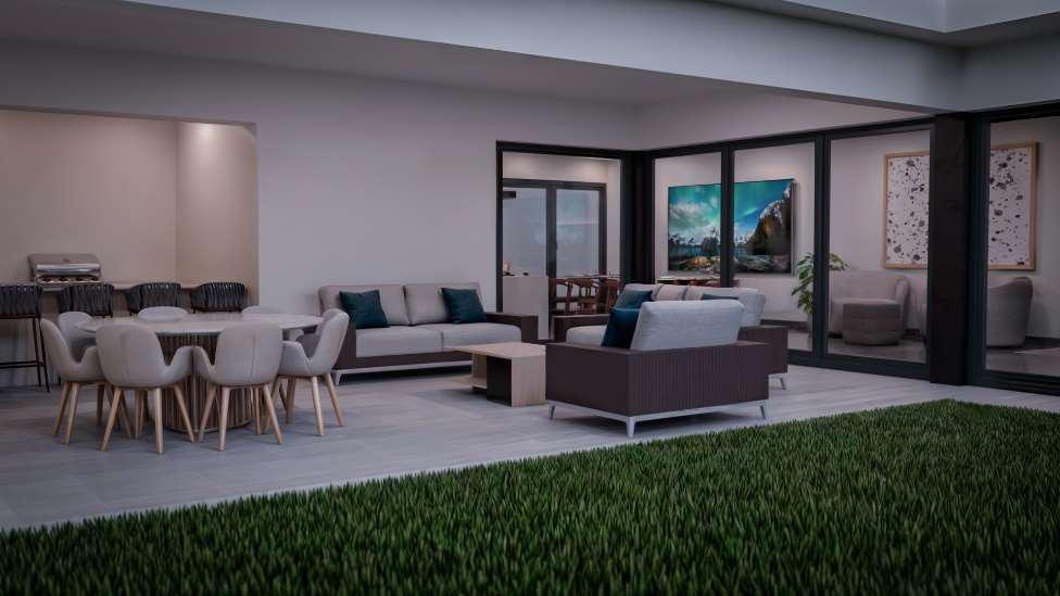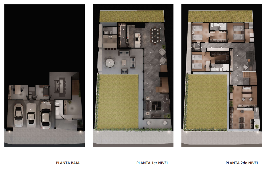 PLANTA PLANTA BAJA – cochera triple con triques / cuarto de servicio / área de sótano: sala de cine o gimnasio / home office – pórtico con jardineras / recibidor interior / medio baño de lujo / acceso a área social