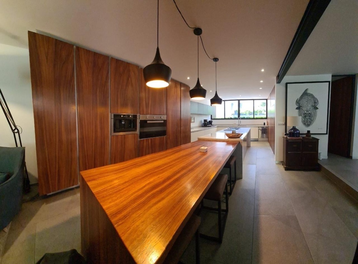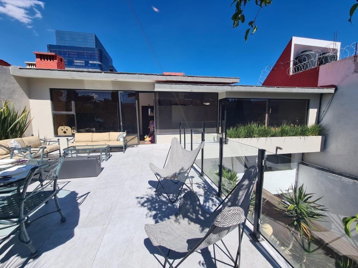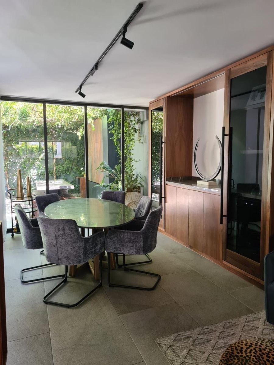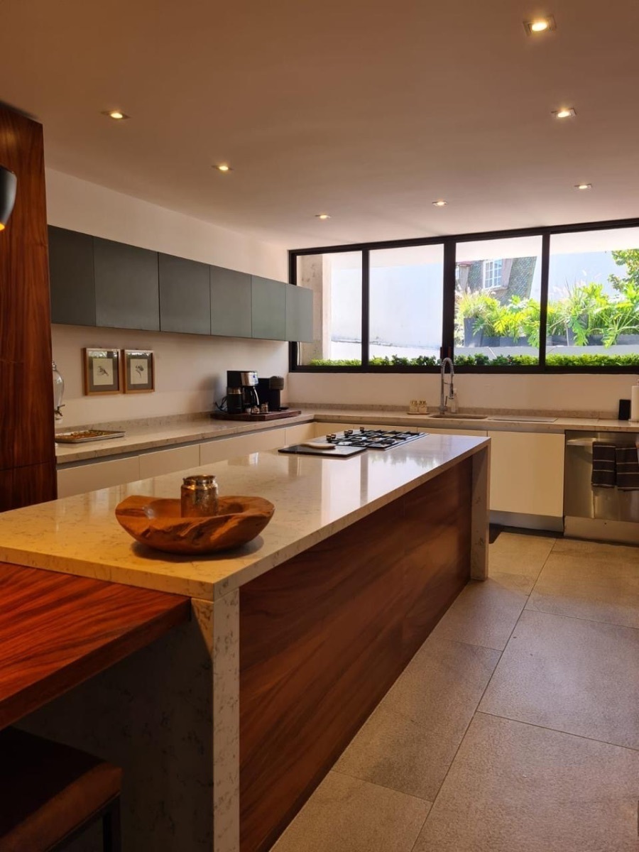 Ubicada en calle tranquila, está hermosa casa cuenta con muy amplia sala, comedor con salida al jardín, cocina abierta muy elegante y práctica con área de desayunador. Baño de visitas.