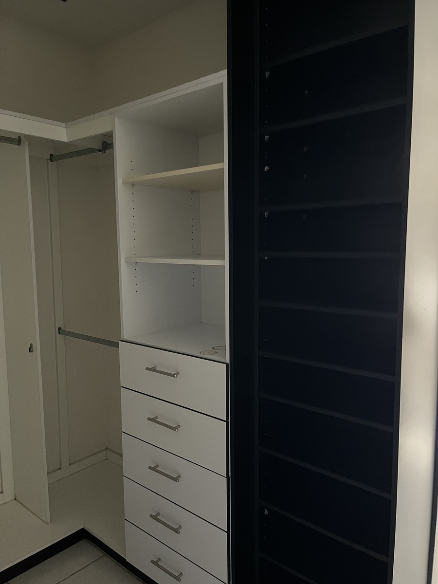 * O quarto principal é espaçoso, equipado com um closet com acabamentos de madeira super bonitos e atemporais.