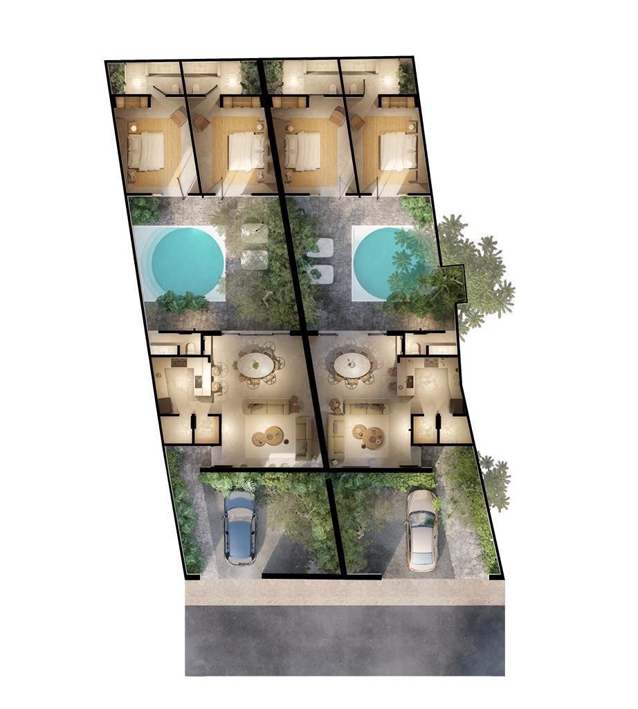 Distribuída, estacionamento, acesso, sala de estar, sala de jantar, cozinha, lavanderia, despensa, banheiro de visitas, pátio, piscina, 2 quartos, 2 banheiros.