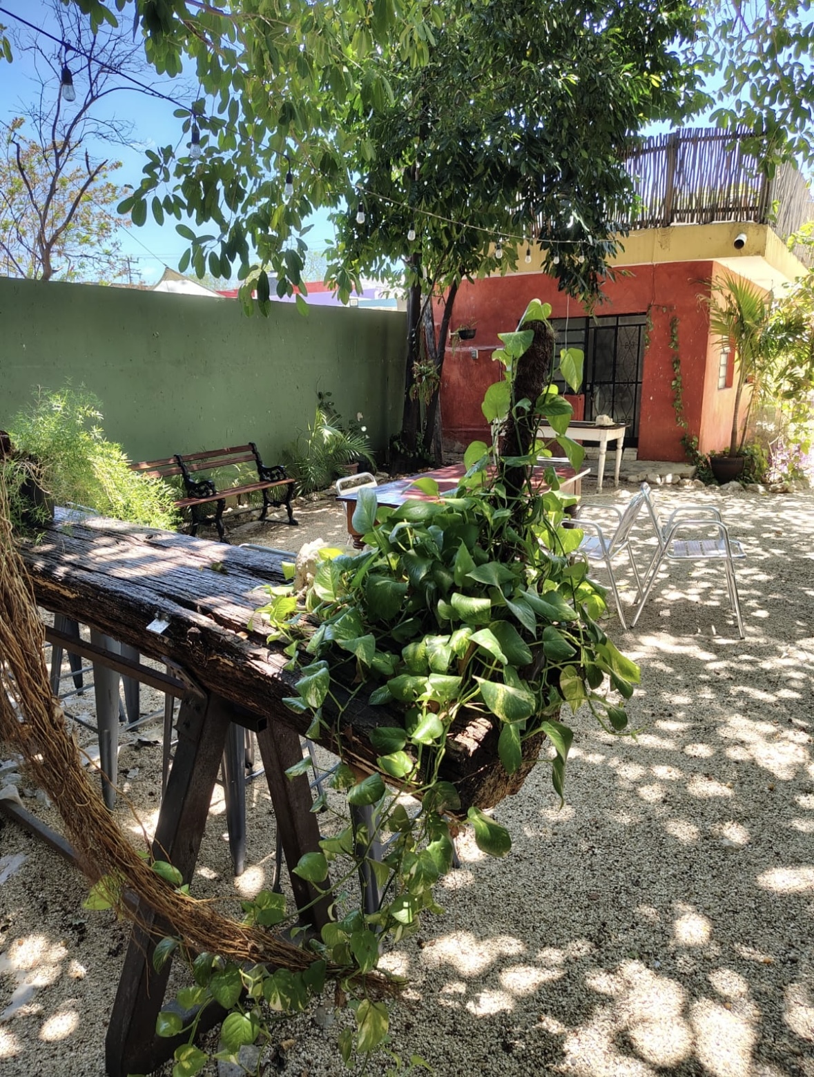 Amplo pátio com área equipada como terraço sob uma grande árvore