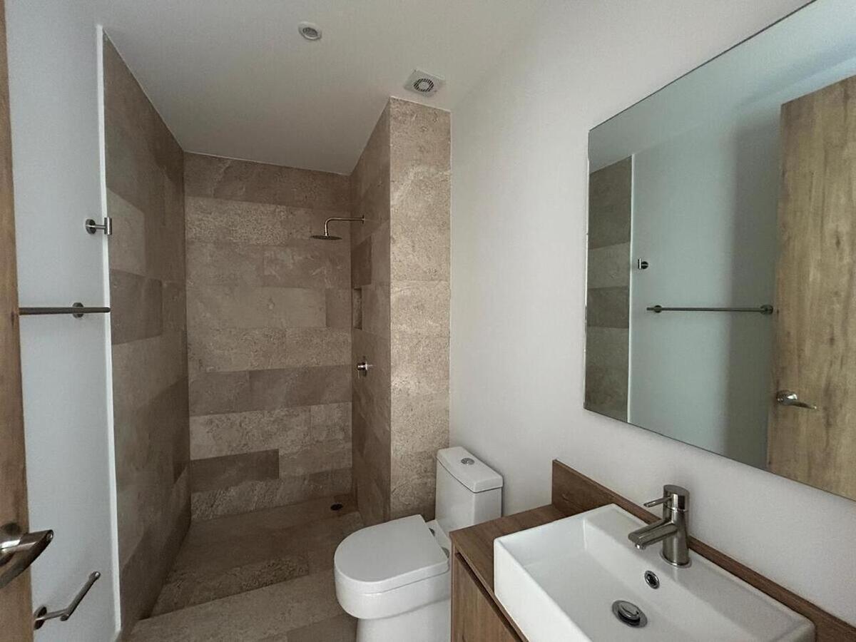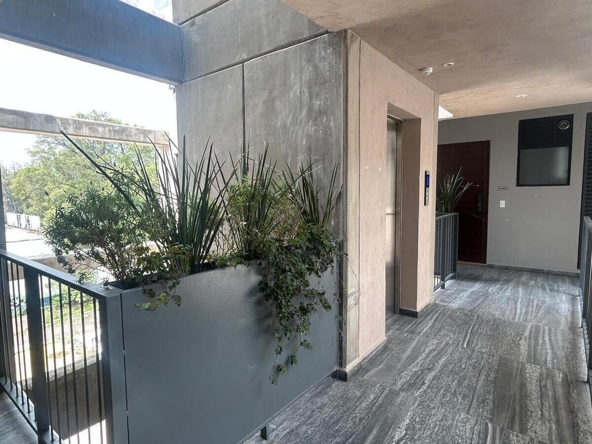 Departamento exterior nuevo, sala comedor con balcón, cocina en L abierta, con cubierta de granito, recámara principal con closet y baño completo, segunda recámara o estudio con closet, baño completo. Lavandería. 1 lugar de estacionamiento techado independiente.