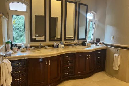 El salón principal, con techos altos y grandes ventanales, inunda los espacios de luz natural, creando un ambiente cálido y abierto en toda la casa. Las recámaras, igualmente amplias, cuentan con techos elevados que amplifican la sensación de espacio y confort. Desde la propiedad, se disfruta de una vista directa al green del hoyo 6.