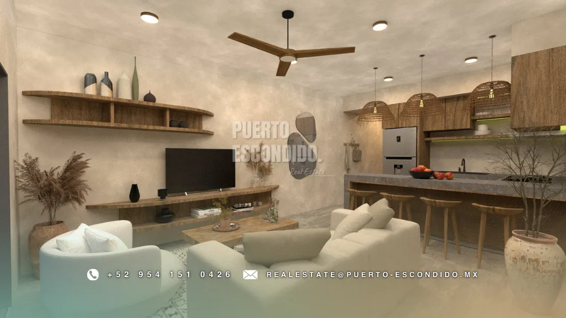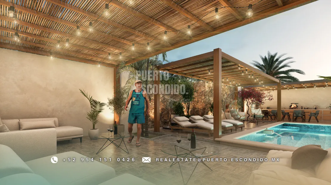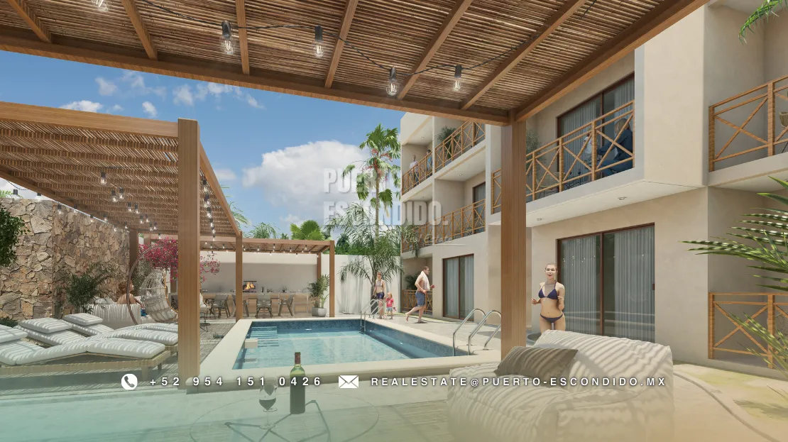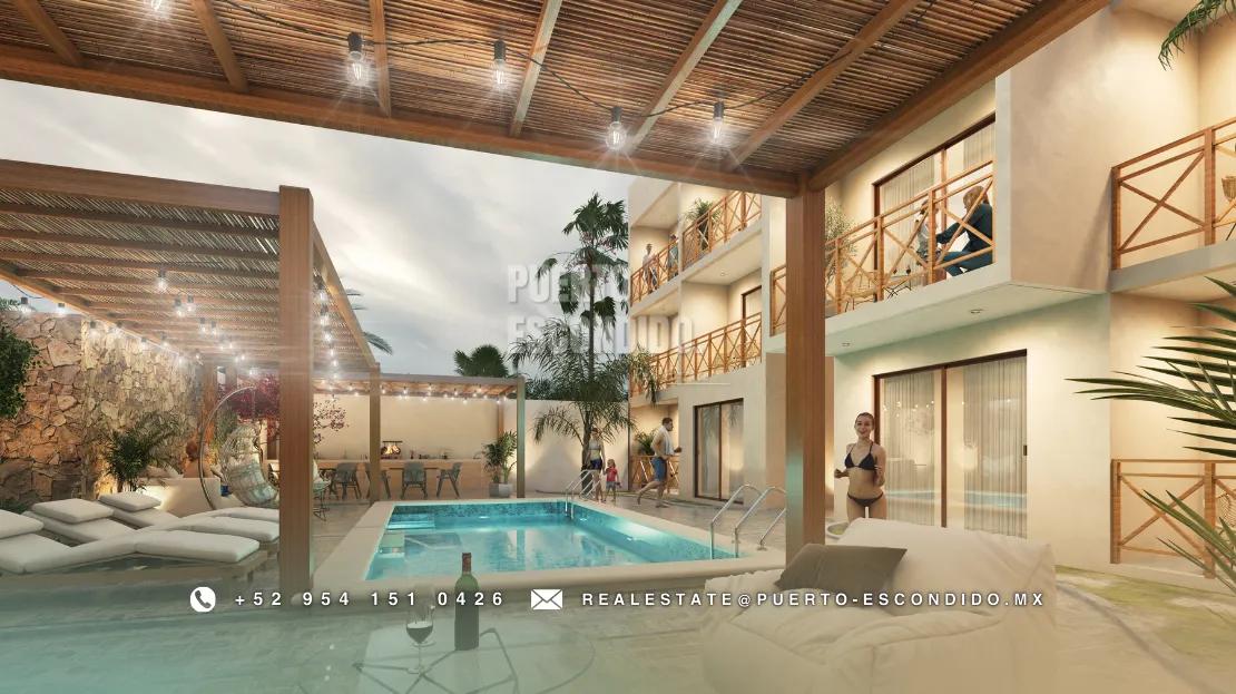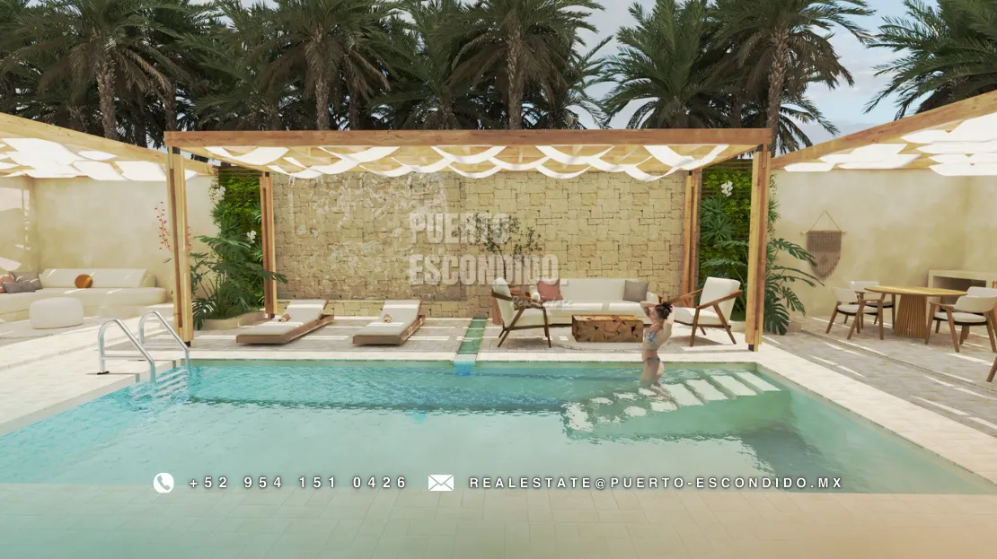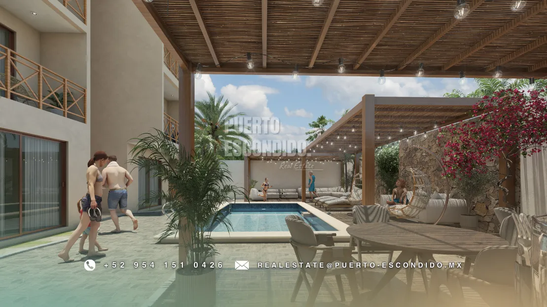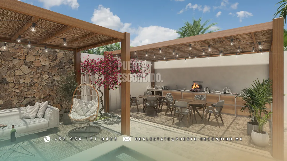 A pocos minutos de Playa La Punta y Zicatela, este desarrollo ofrece cercanía a cafés, mercados, y entretenimiento. Incluye rooftop con vista panorámica, área de asador, gimnasio, alberca y terrazas comunes.